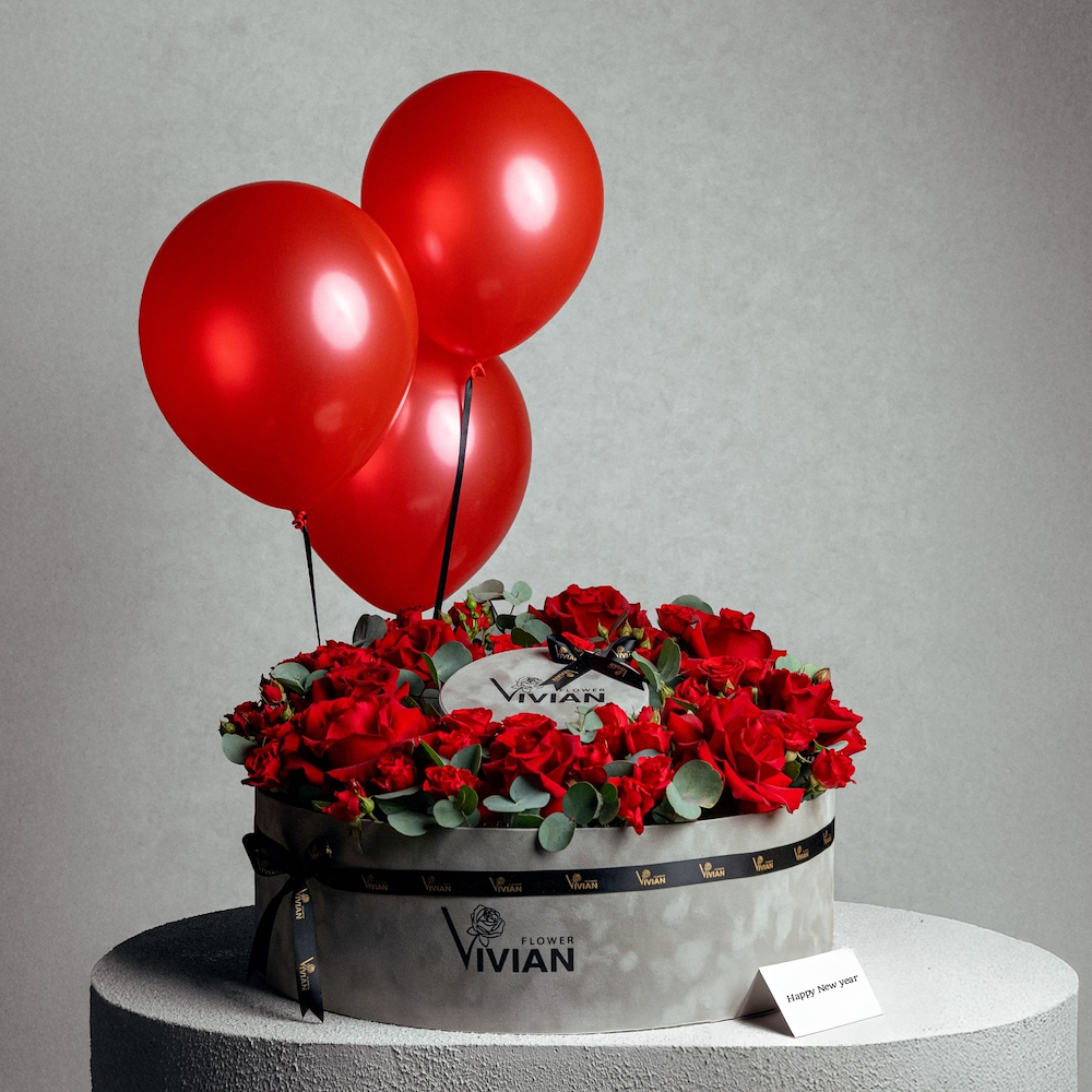 صينية مرتبة بزهور الجوري والبيبي جوري الحمراء تتوسطها علبة شوكولاتة فاخرة والبالونات.