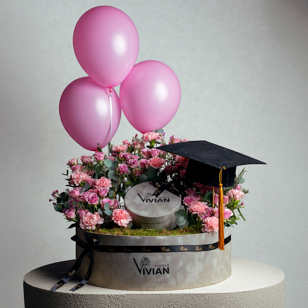 احتفال التخرج في علبة مخملية مرتبة بزهور الكارنيشن والبيبي جوري تتوسطها علبة الشوكولاتة اللذيذة وتقدم مع البالونات.