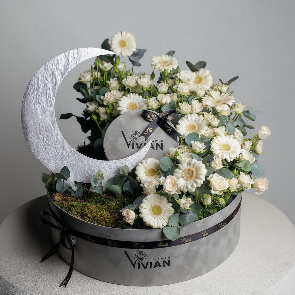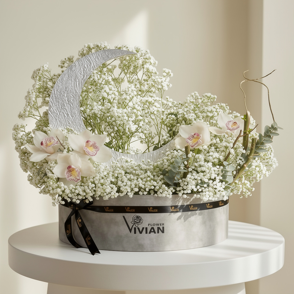 صندوق فيلفيت أنيق بتصميم فاخر مليئة بالجيبسوفيلا والسيمبيديوم مع هلال رمضان.