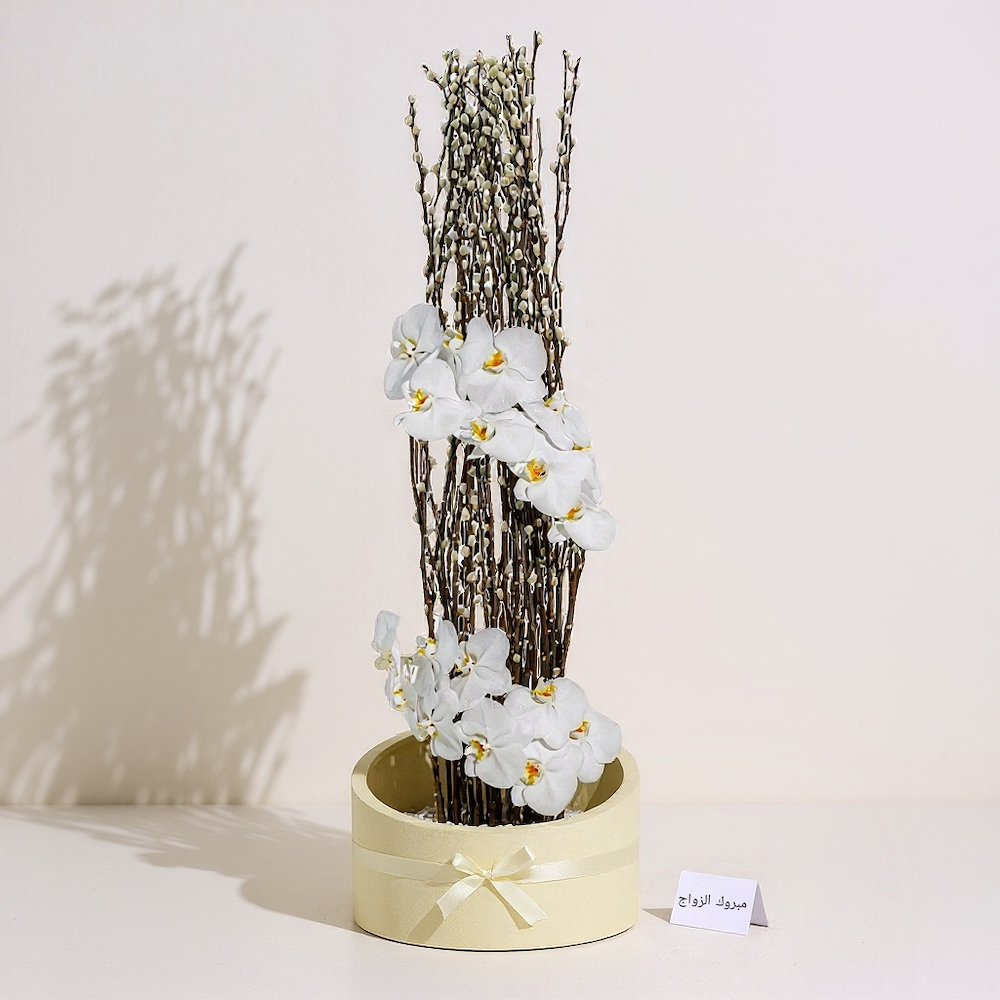أغصان القطن المميزة محاطة بزهور الأوركيد الرائعة بتنسيقها الفريد.