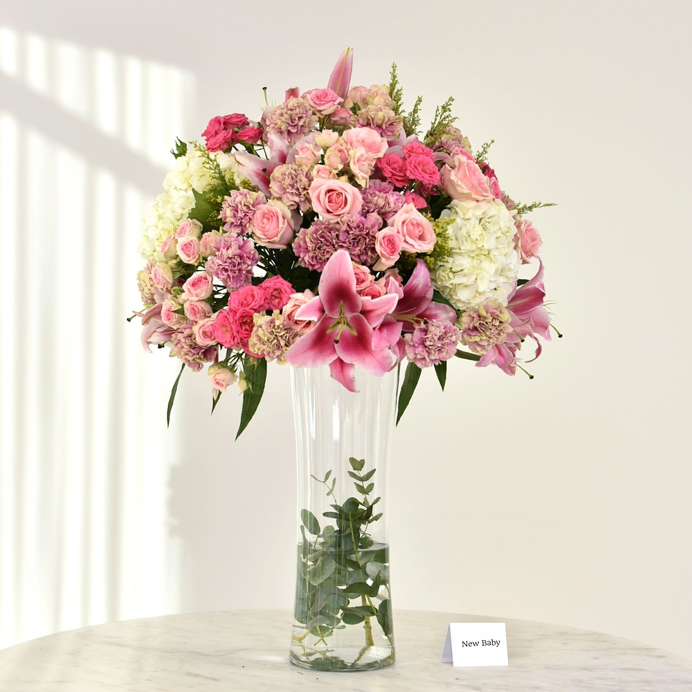 فازة تحتوي على مزيج من أزهار الكازابلانكا، الكارنيشن، الجوري، البيبي روز والهايدرينجا.