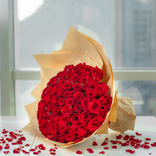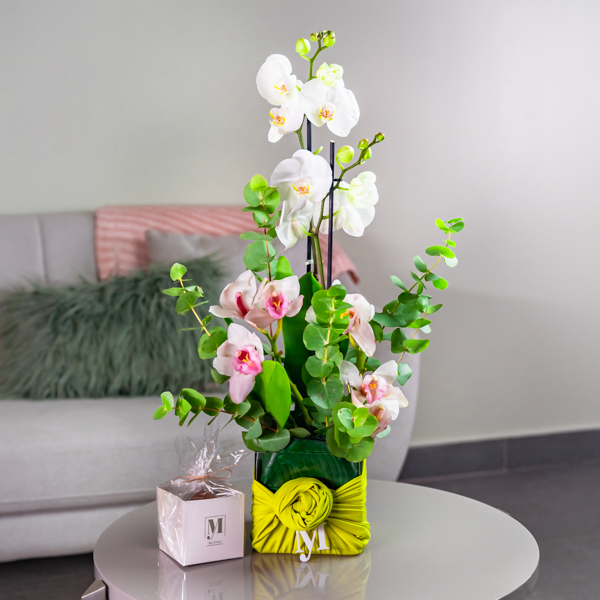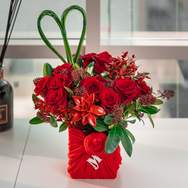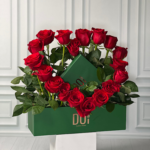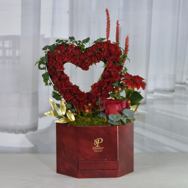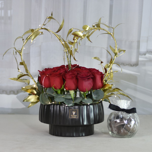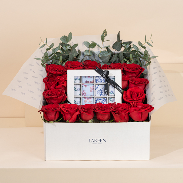 فازة بتصميم مربع من الجوري وبوكس الشوكولاتة بتصميم القلب.