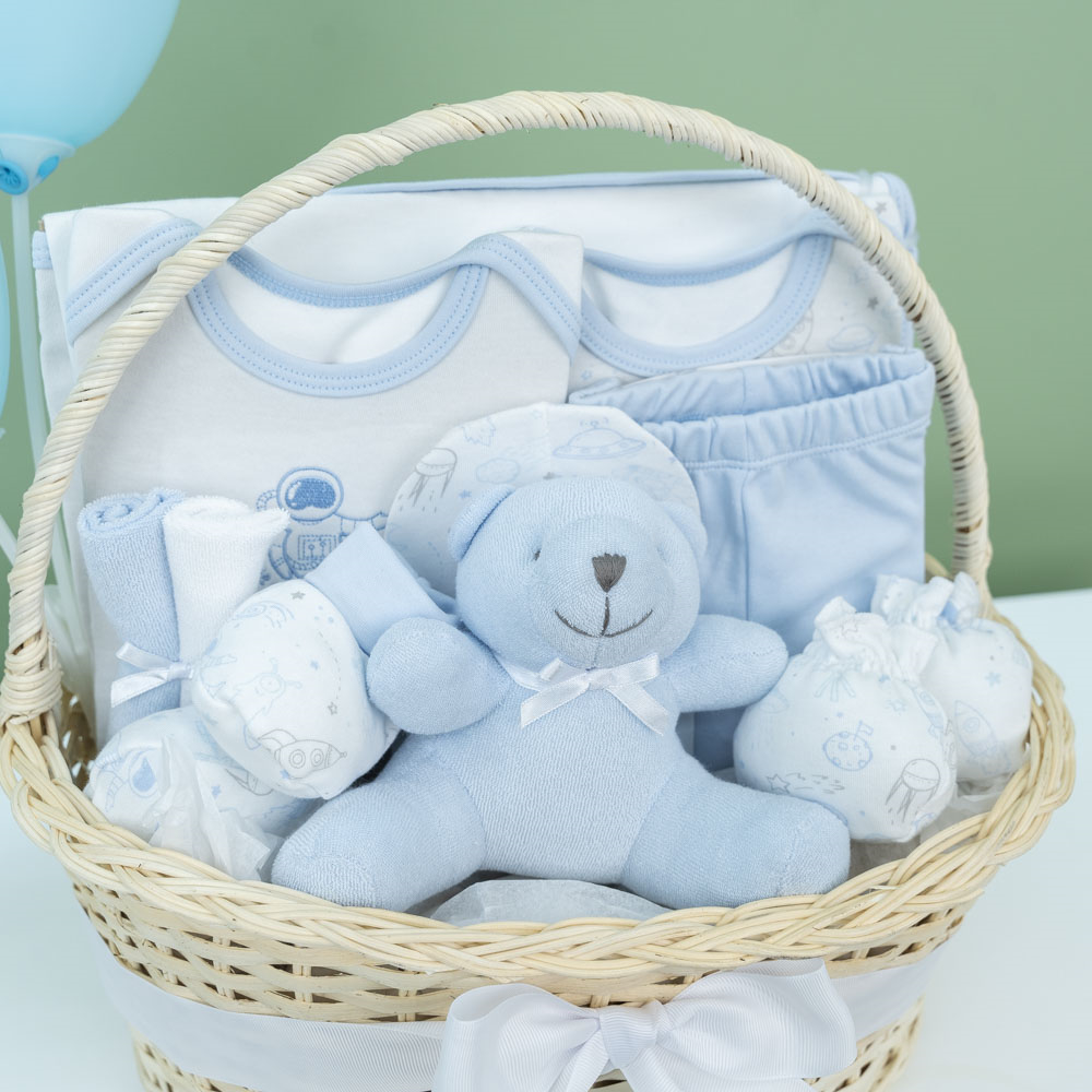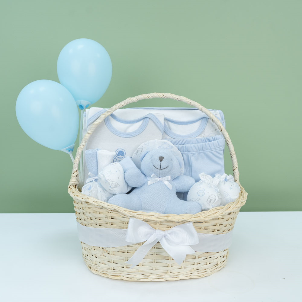سلة أنيقة مزينة بالبالونات تحتوي على أغراض الطفل الأساسية.