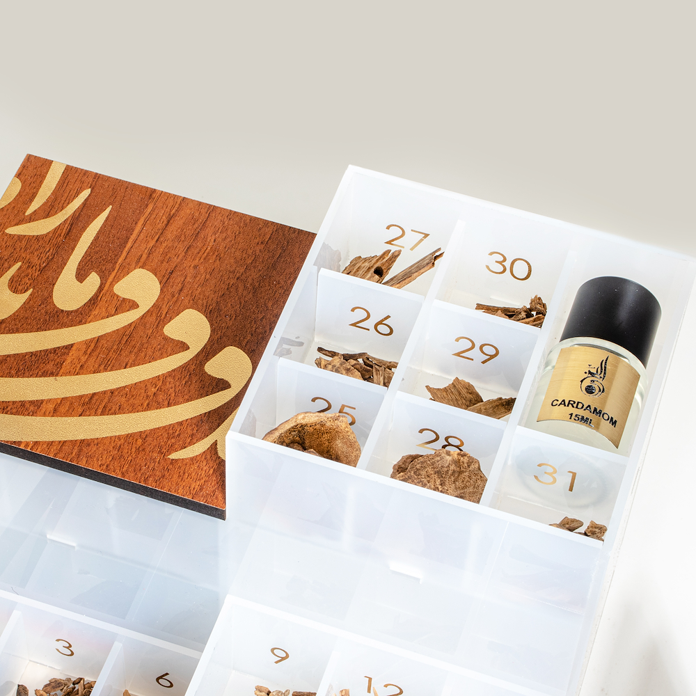 علبة فاخرة تحتوي على ٣١ نوع مختلف من البخور. تحتوي العلبة على: 31 نوع بخور. عطر ١٥مل. فحم حجم ميني. ملقط فاخر.
