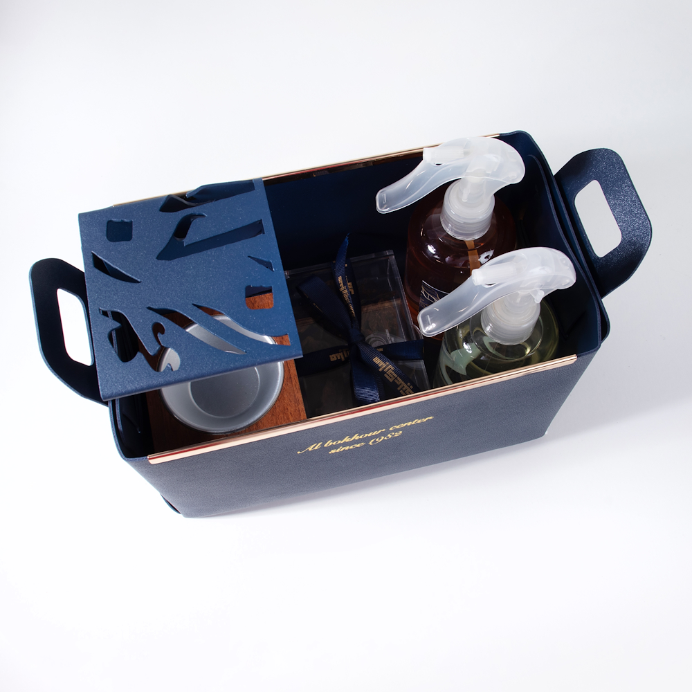 سلة ليذر فاخرة تحتوي على احتياجات الأساسية. تحتوي السلة على: مبخرنا المميز. تولة بخور. رشوش. ملقط فخم.