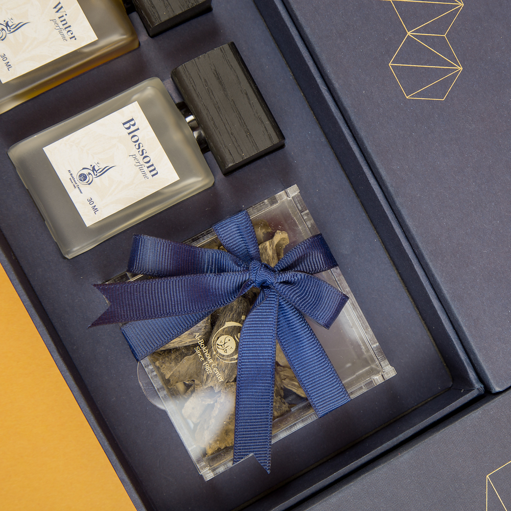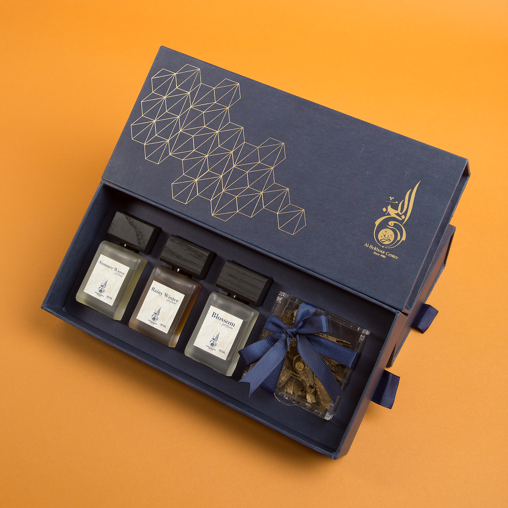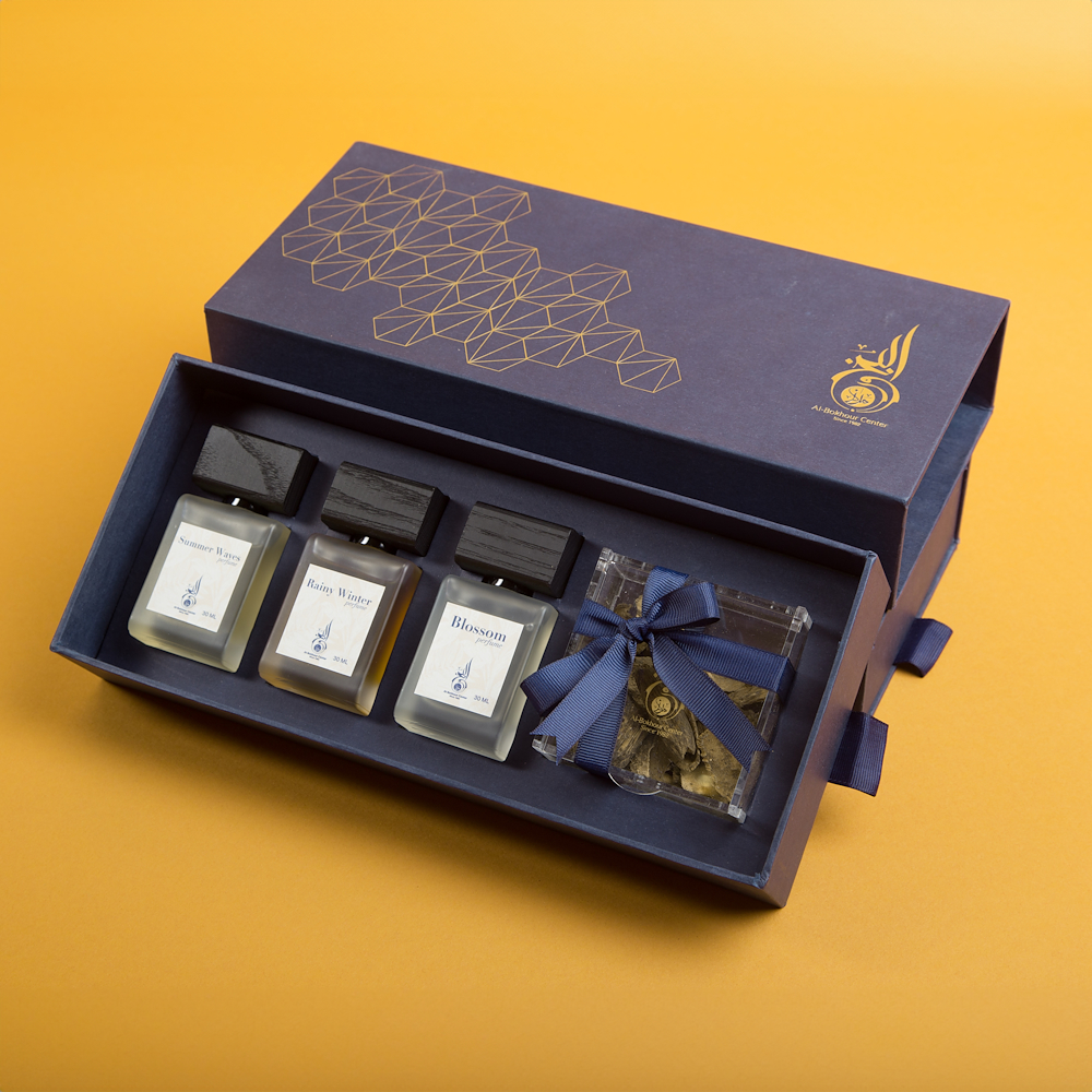 بوكس يحتوي على 3 عطور، بحجم 30 مل بالإضافة إلى علبة بخور كمبودي.