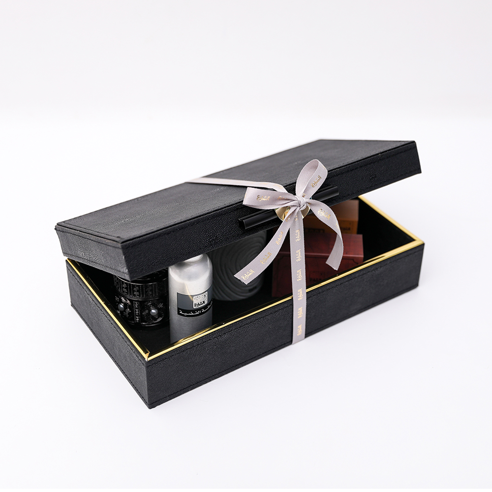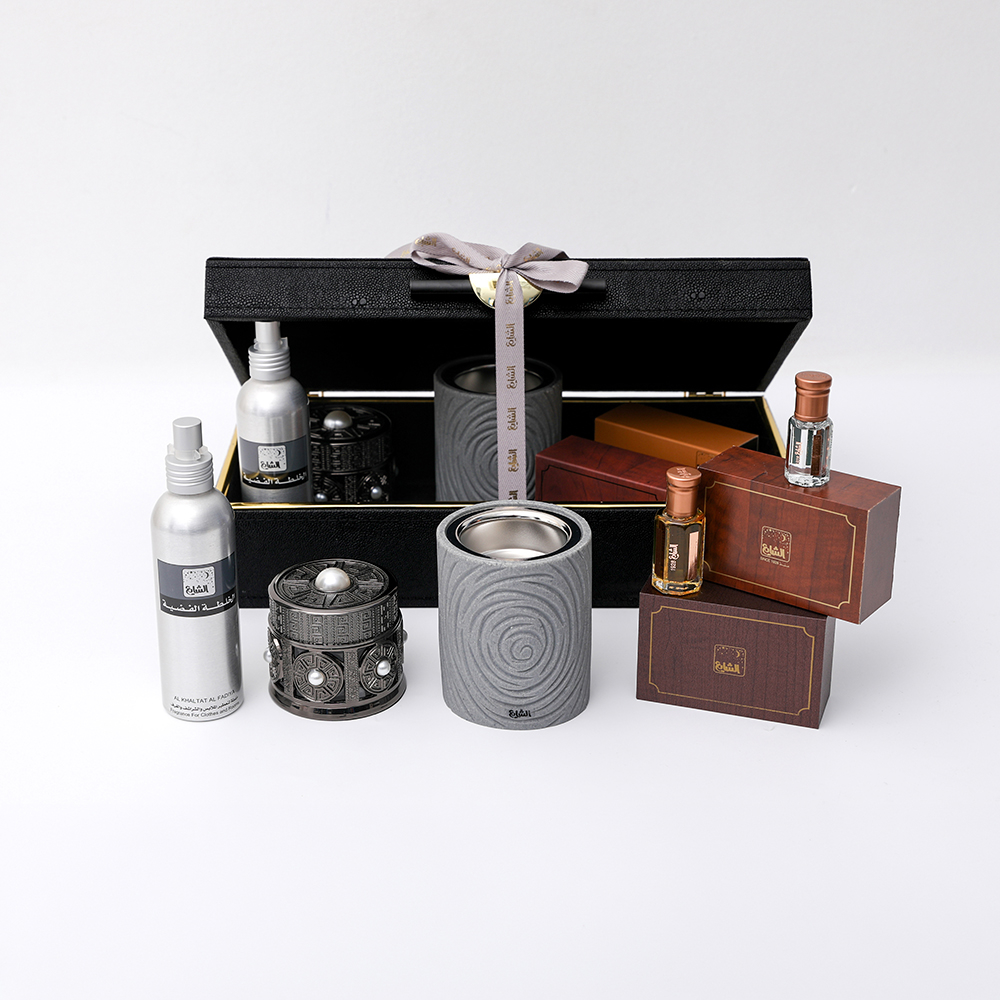 هدية خاصة تضم كل ما يلزم للتعطير برائحة دافئة تبعث السكينة، تشمل مبخرة انيقة، معطر اقمشة وجو سيلفر بليند 150 مل، دهن مسك أبيض 12 توله برائحة ناعمة ونقية، دهن عود "مجموعة" 12 مل بتركيبة خشبية مميزة، بخور مسك رمادي برائحة شرقية اصيلة، وبوكس جلد اخضر فاخر، هدية مثالية لمن تحب.