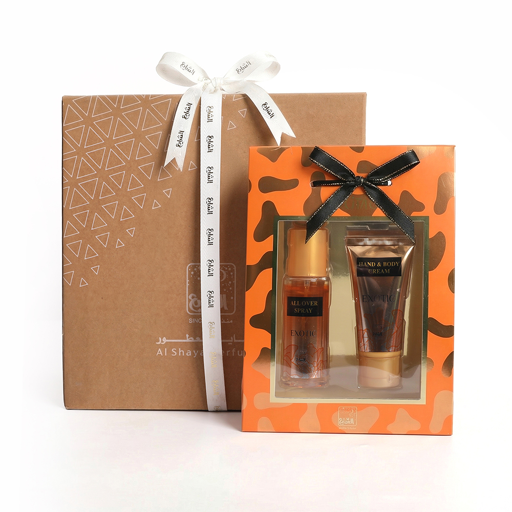 مجموعة هدايا انيقة تضم 5 توزيعات من مجموعة اكزوتك، تقدم هدية مميزة بعطر فريد لمشاركة فرحة الشهر الكريم مع من تحب، تحتوي كل توزيعة على بودي ميست 75 مل برائحة منعشة وكريم لليد والجسم 57 مل للعناية والترطيب، مقدمة بأسلوب أنيق يترك أثراً جميلاً.