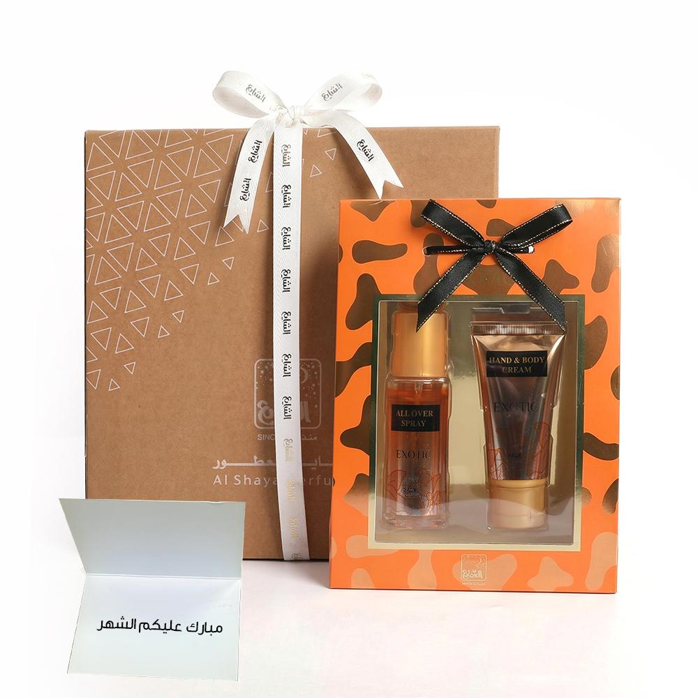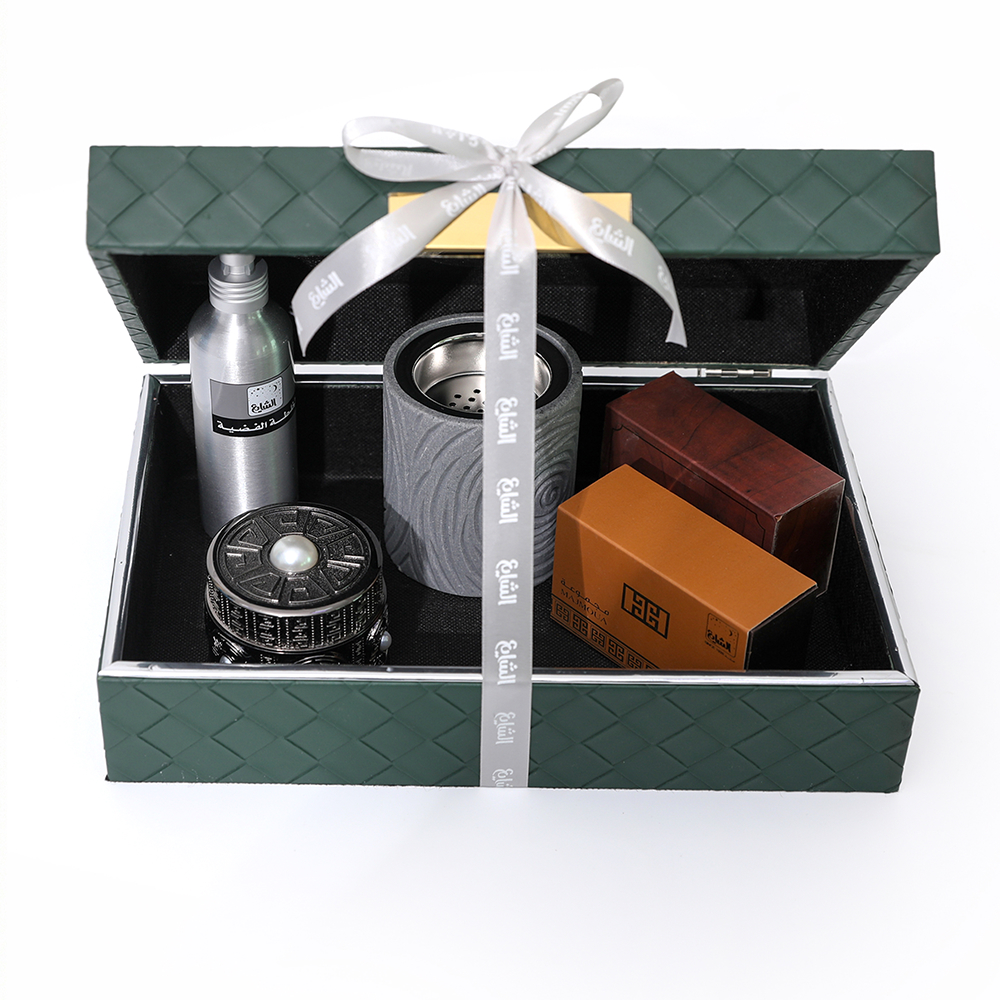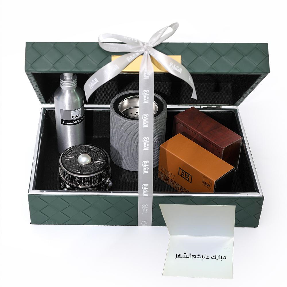 هدية خاصة تضم كل ما يلزم لتعطير ليالي الشهر الكريم برائحة دافئة تبعث السكينة، تشمل مبخرة انيقة، معطر اقمشة وجو سيلفر بليند 150 مل، دهن مسك ابيض 12 توله برائحة ناعمة ونقية، دهن عود "مجموعة" 12 مل بتركيبة خشبية مميزة، بخور مسك رمادي برائحة شرقية اصيلة، وبوكس جلد اخضر فاخر، هدية مثالية لمن تحب.