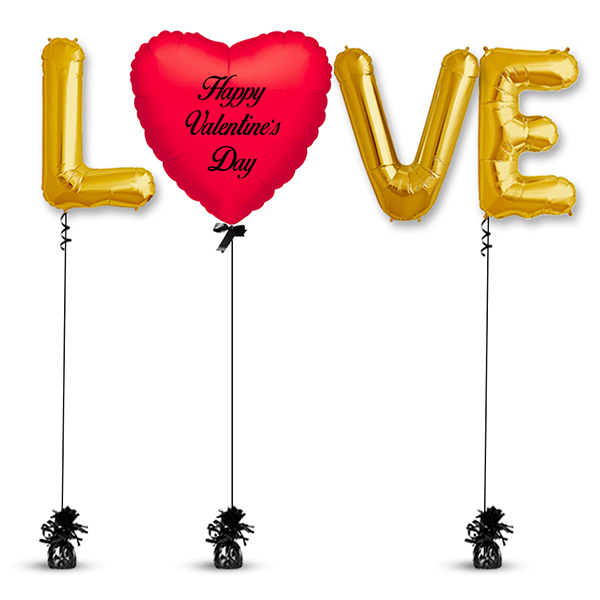 1 قطعة كبيرة L احباط بالون. 1 قطعة كبيرة الخامس احباط بالون. 1 قطعة كبيرة E احباط بالون. 1 قطعة 32 بوصة بالون جامبو القلب مع رسالة "عيد الحب سعيد" في ملصق أسود. الشريط والوزن لعقد البالون. جميع البالونات معبئة بالهيليوم.