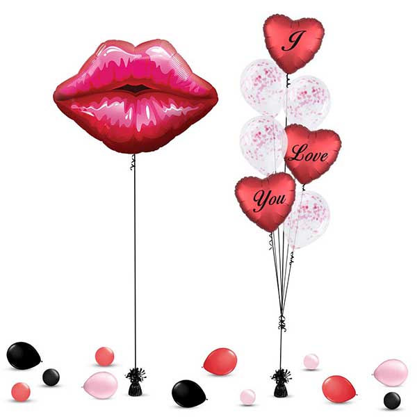 3 قطع 20 بوصة بالون ساتان قلب أحمر مع رسالة "أنا أحبك" باللون الأسود. 4 قطع 11 بوصة بالون النثار الوردي. 1 قطعة 30 بوصة بالون أحمر شفاه. 15 قطعة 5 بالونات لاتكس باللون الأحمر والأسود والوردي.