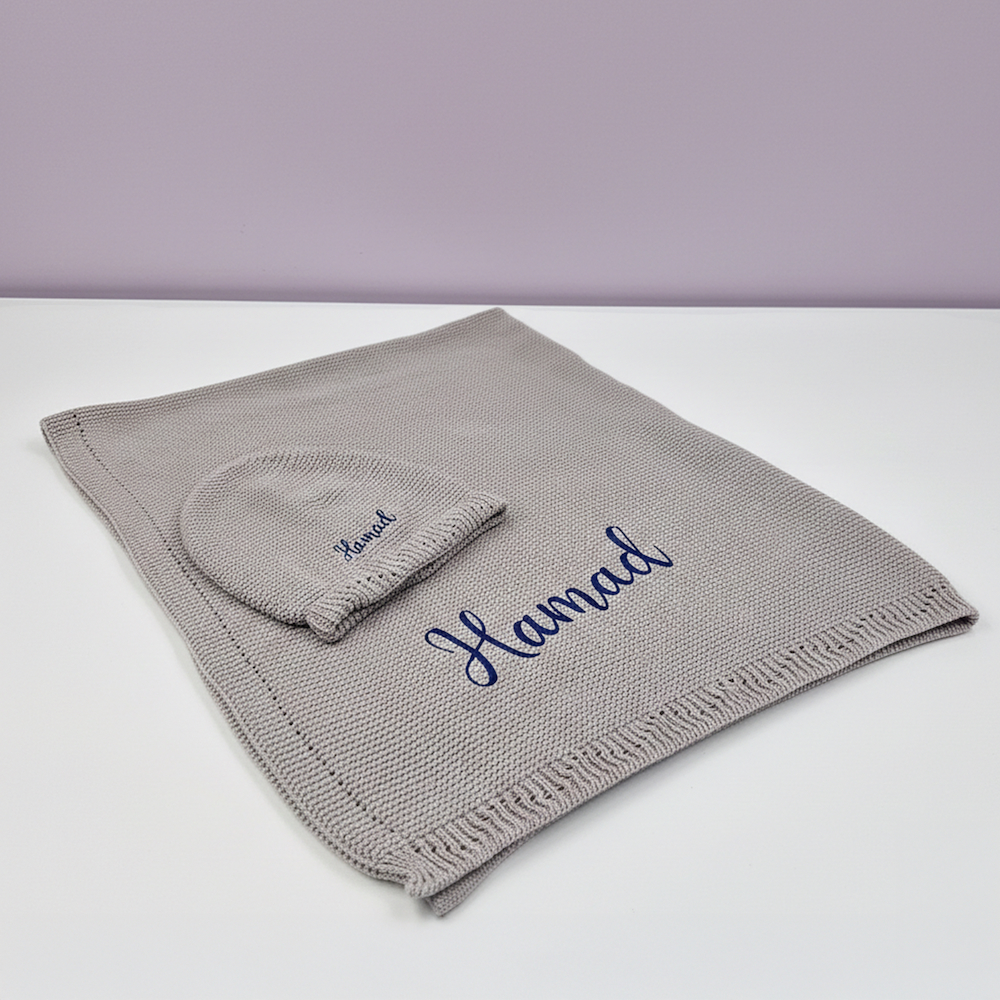 طقم مميز يتكون من بطانية فاخرة كبيرة مع الإسم وقبعة أطفال مصنوعة من القطن العضوي 100%. يمكن إضافة أحرف أو اسم عليه باللغة العربية أو الإنجليزية.