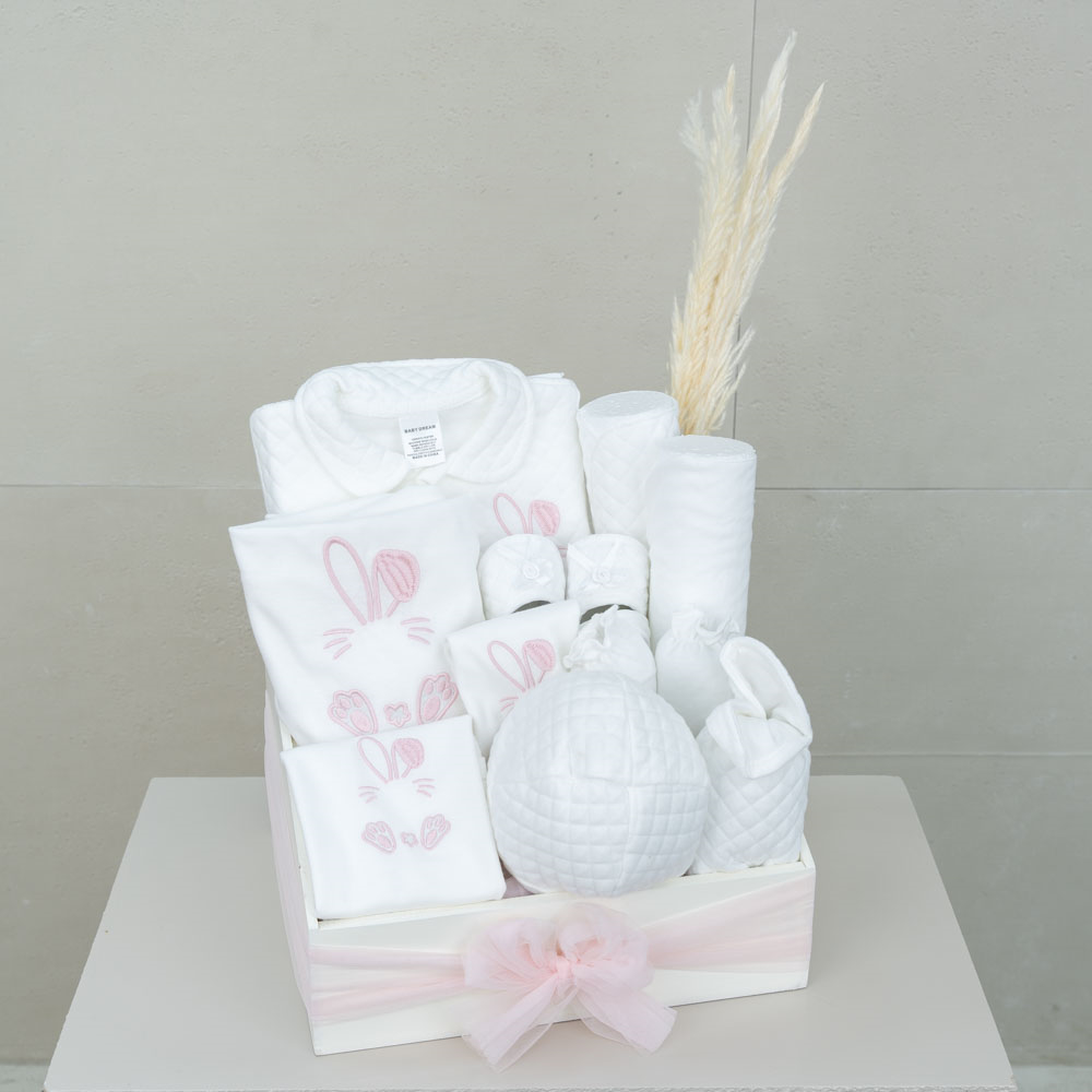 صندوق خشبي مزين بالزهور المجففة يحتوي على مستلزمات الطفل.