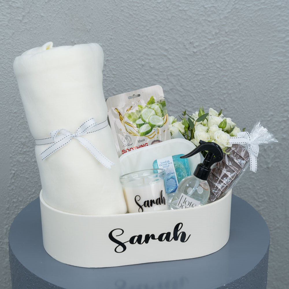 صينية مزينة بالزهور تحتوي على كوب حراري، شمعة، كرات استحمام، صابون، وملح استحمام.