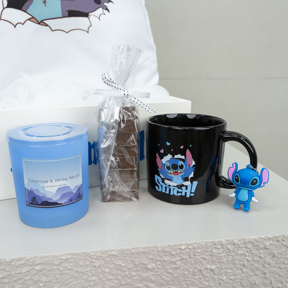 صندوق خشبي بداخله بالون بوبو، يحتوي على وسادة، وشمعة برائحة المحيط، وكوب مع سلسلة مفاتيح، و8 قطع من الشوكولاتة البلجيكية المحشوة برقائق الويفر.