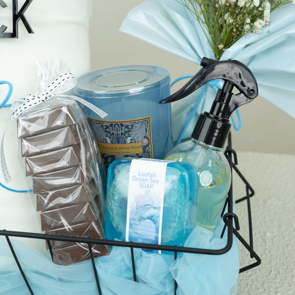 سلة جميلة تحتوي على باقة من زهور الجبسوفيلا، بطانية لشخص واحد، الشوكولاتة البلجيكية المغلفة، شمعة معطرة، صابون طبيعي برائحة المحيط ومرش الغرفة.