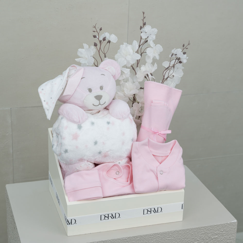 صندوق خشبي مزين بالزهور الإصطناعية يحتوي على مستلزمات الطفل الأساسية: دمية دب، بطانية صغيرة، ملاءات سرير، قطعة ملابس واحدة، قبعة، ومريلة.