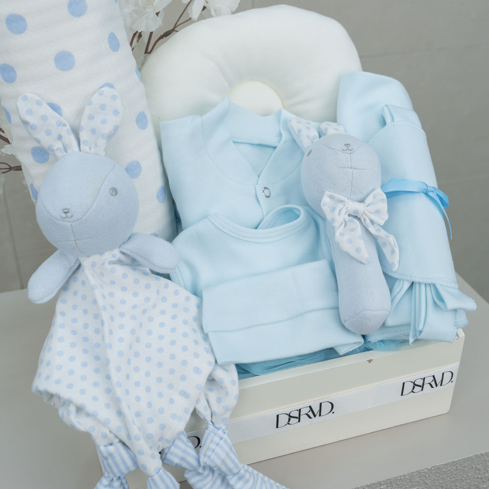صندوق خشبي مزين بالزهور الإصطناعية يحتوي على مستلزمات الطفل الأساسية: دمية دب، بطانية صغيرة، ملاءات سرير، قطعة ملابس واحدة، قبعة، لعبة، وسادة، ومريلة.