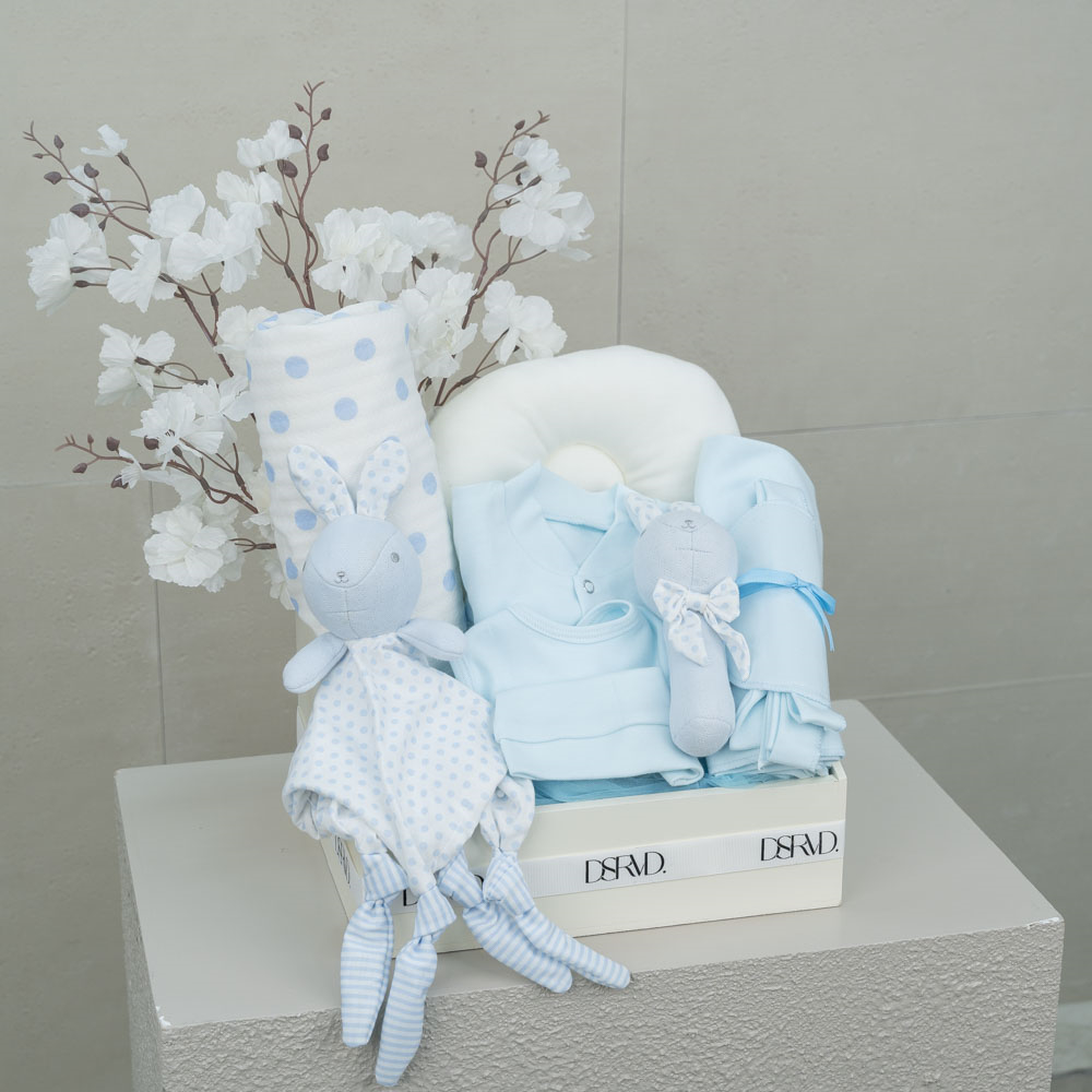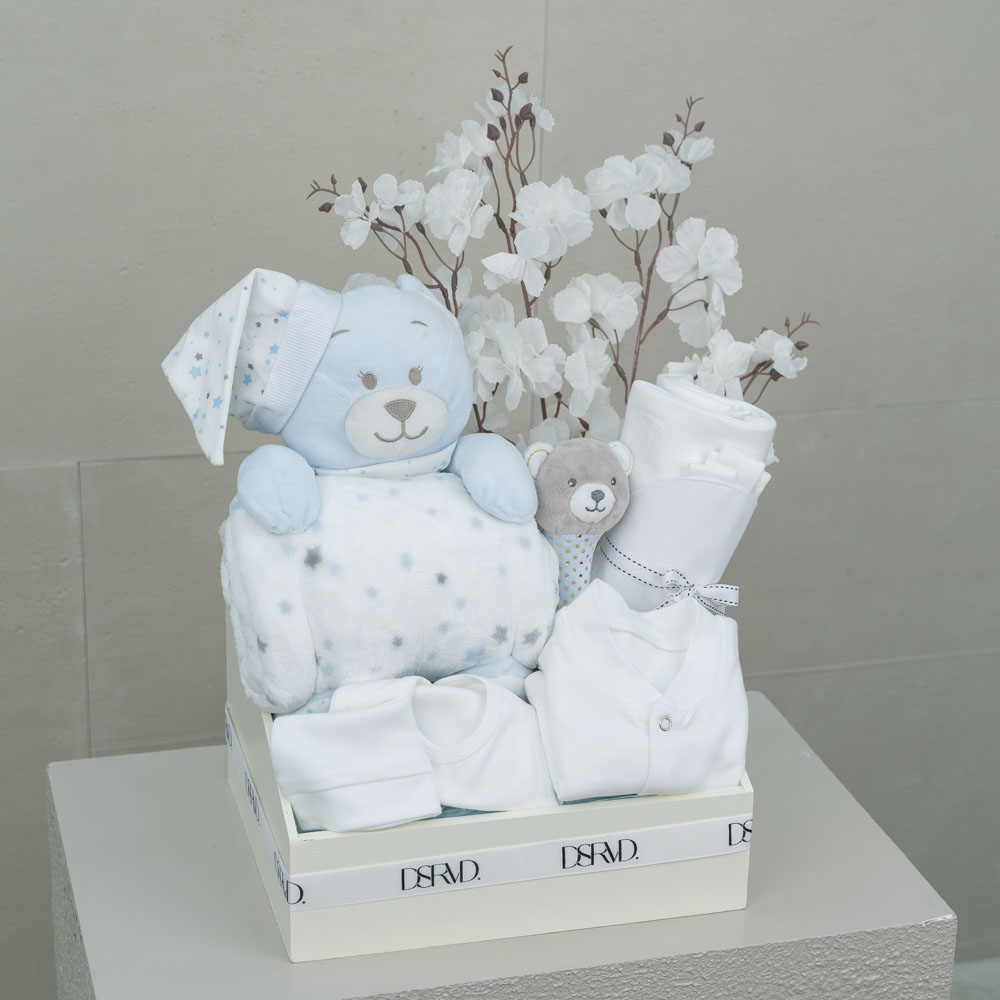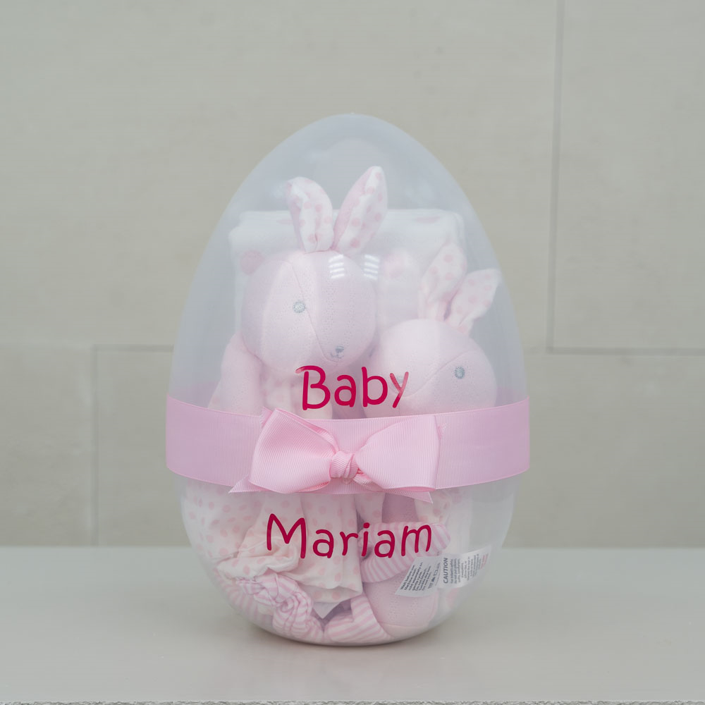 يحتوي صندوق بلاستيكي على شكل بيضة على دمية دب، شرشف أطفال، ولعبة أطفال.