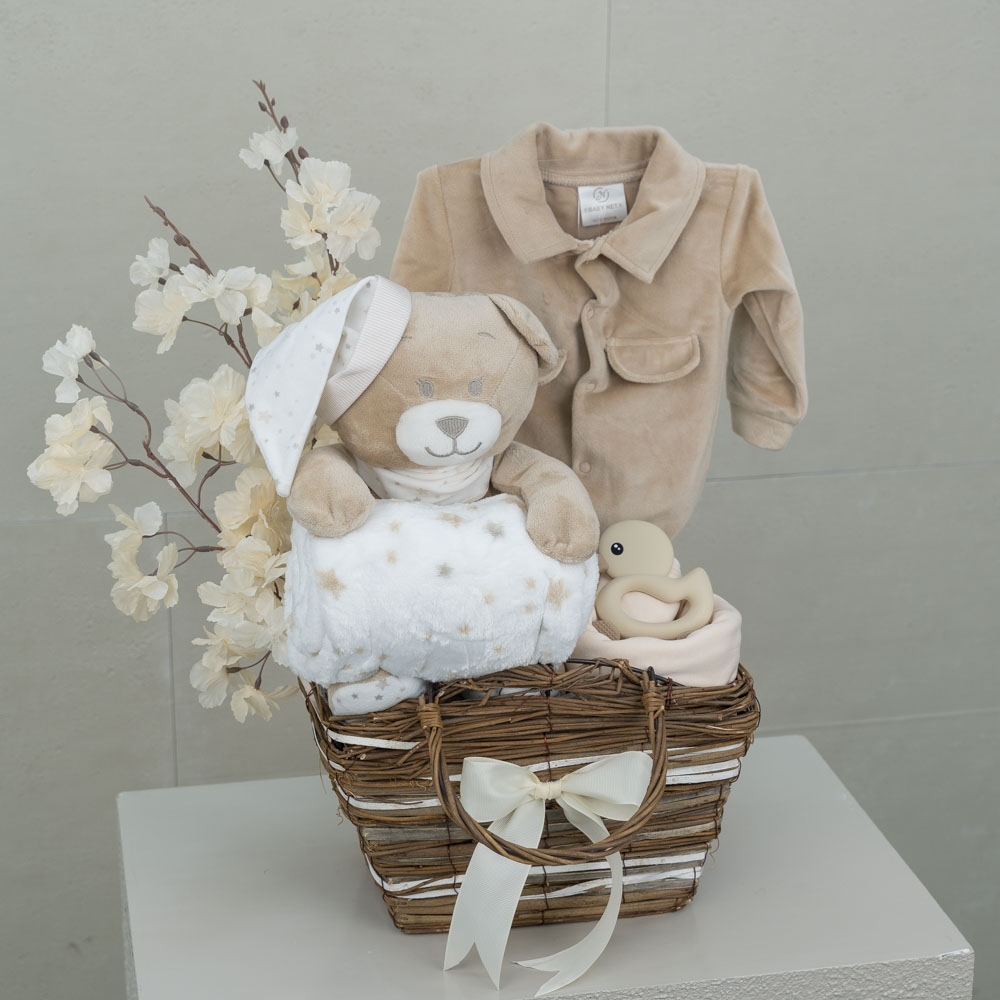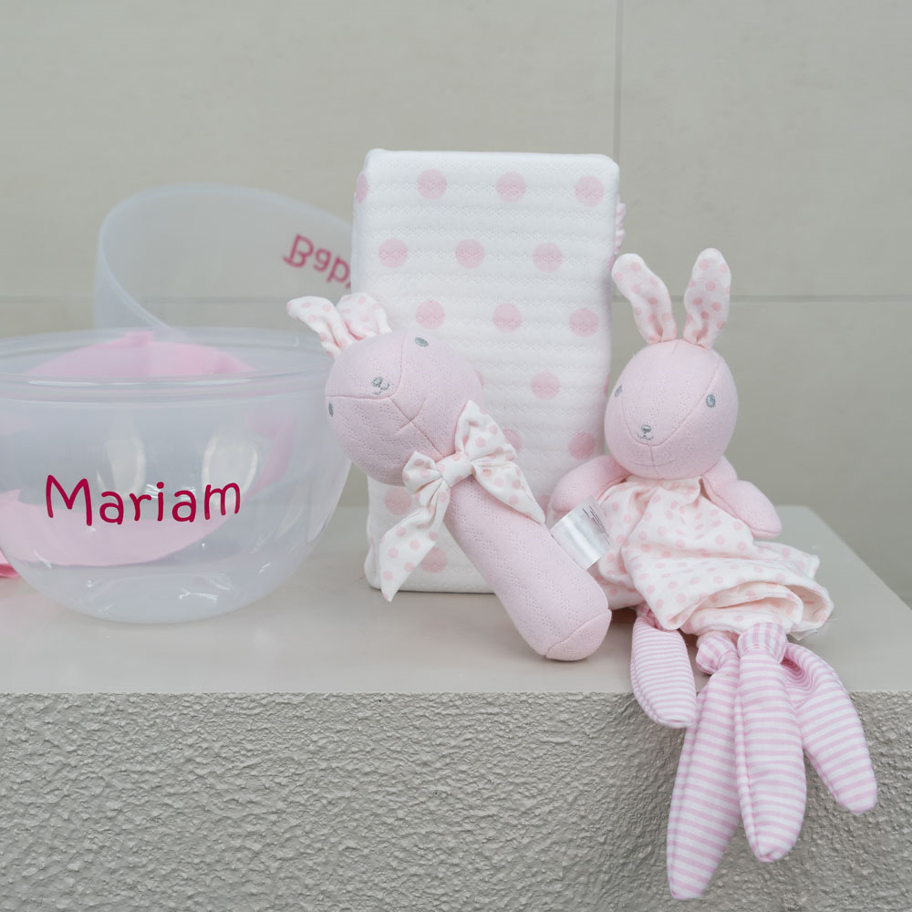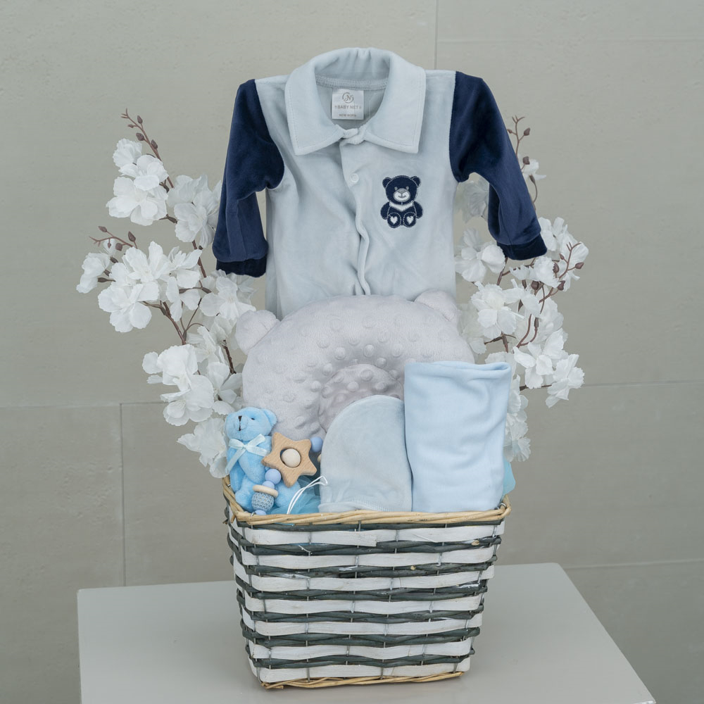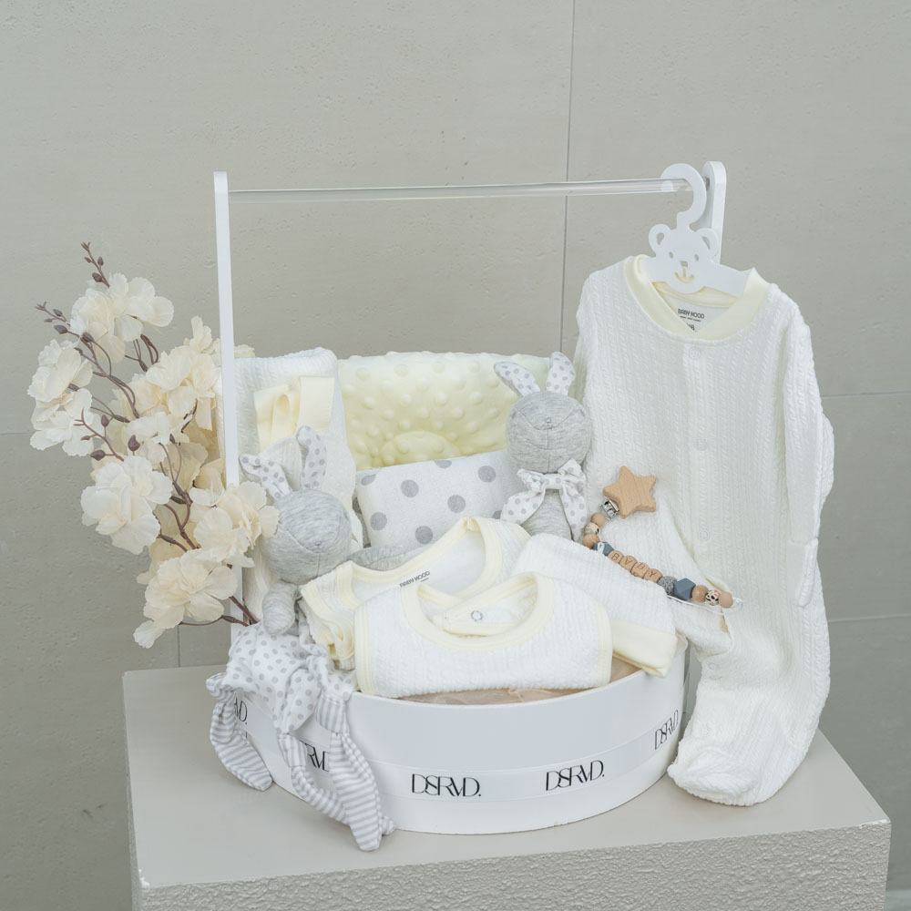 يحتوي صندوق بلاستيكي على شكل بيضة على دمية دب، شرشف أطفال، ولعبة أطفال.