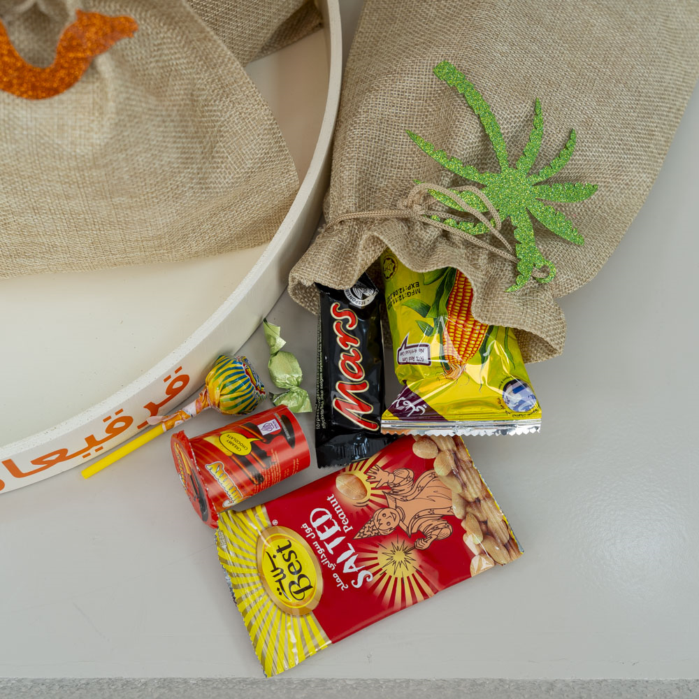 صينية خشبية أنيقة تضم 12 كيس شوكولاتة متنوعة فاخرة، مع إمكانية كتابة الاسم.