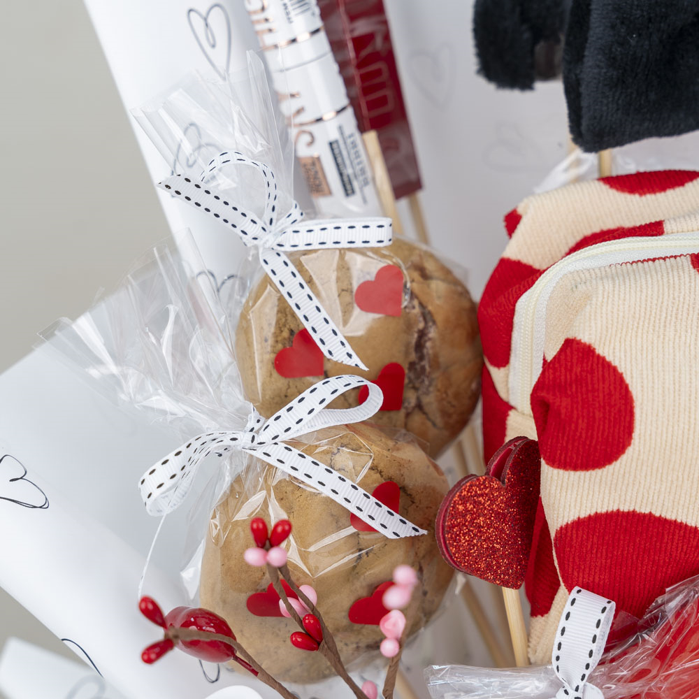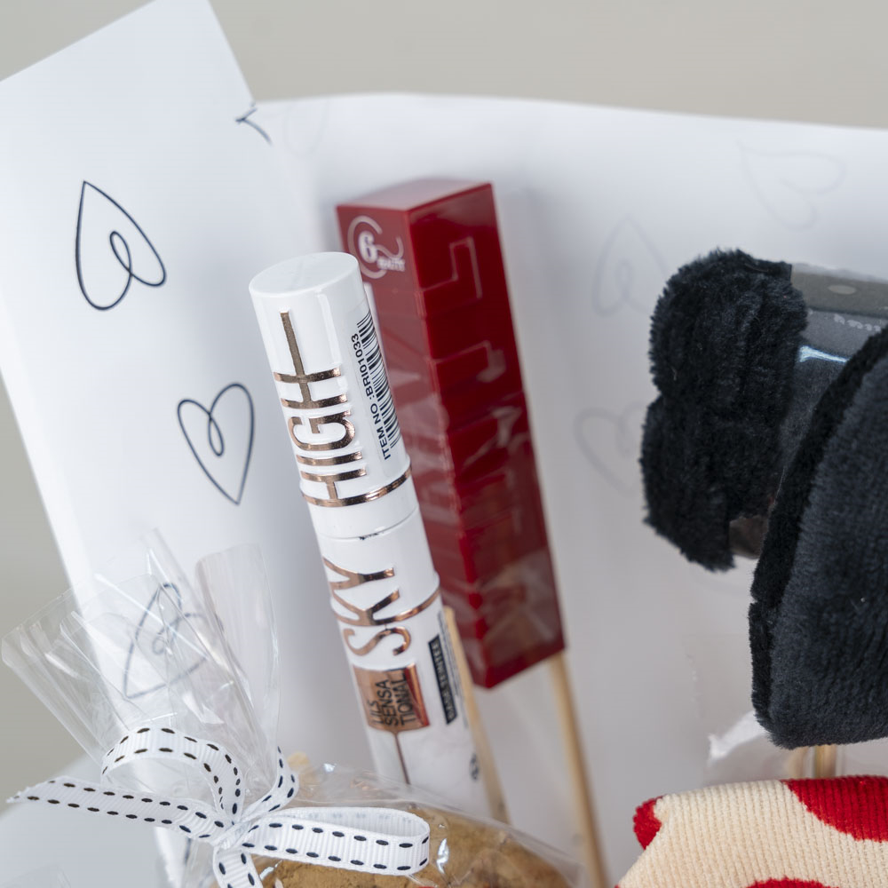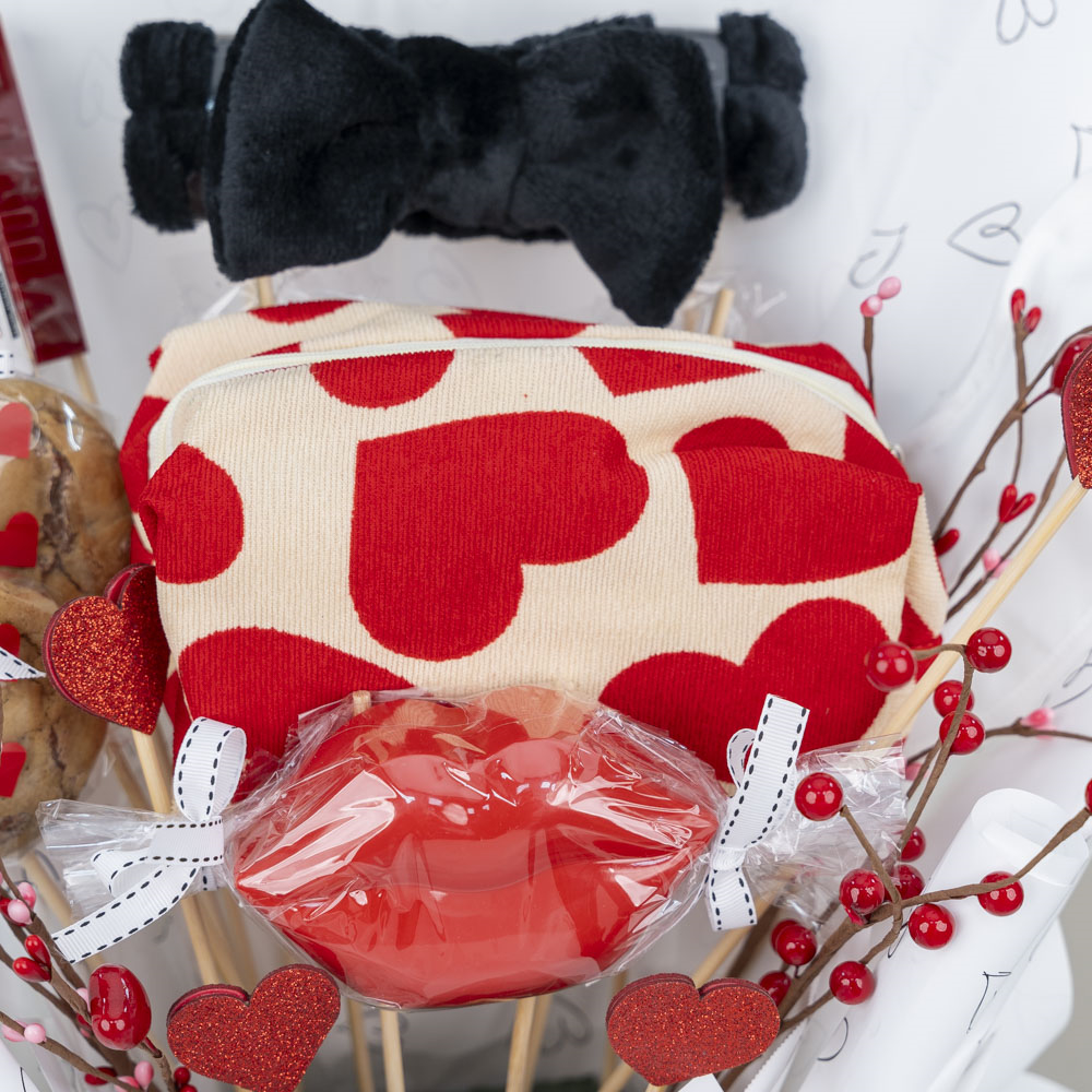 باقة مزينة بأغصان القلوب الصناعية تحتوي على حقيبة المكياج، أحمر الشفاة، ماسكارا، عصابة الرأس، عصابة العين وماسك الشفاة مع قطعتين من الكوكيز برقائق الشوكولاتة.