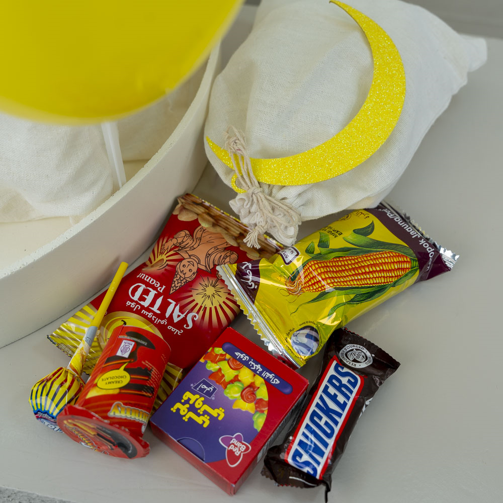 صينية خشبية أنيقة تضم 12 كيس شوكولاتة متنوعة فاخرة، مع بالونات، مع إمكانية كتابة الاسم.