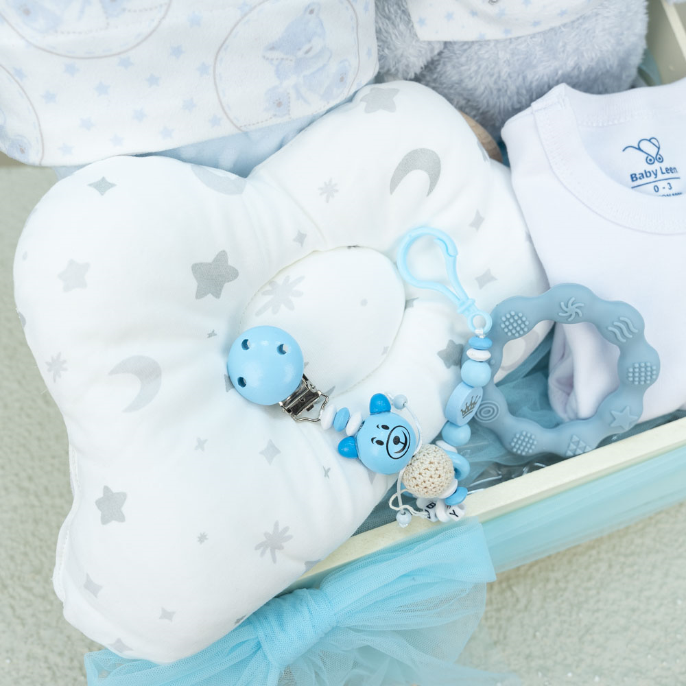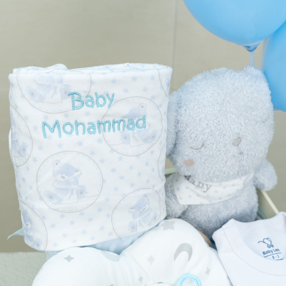 علبة خشبية تحتوي على مستلزمات أساسية للرضيع مع إمكانية اختيار اسم الطفل ليتم تطريزه على بطانية الطفل.
