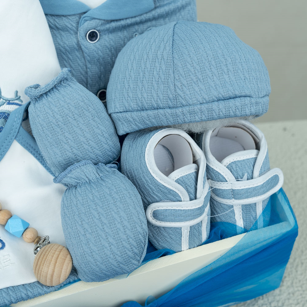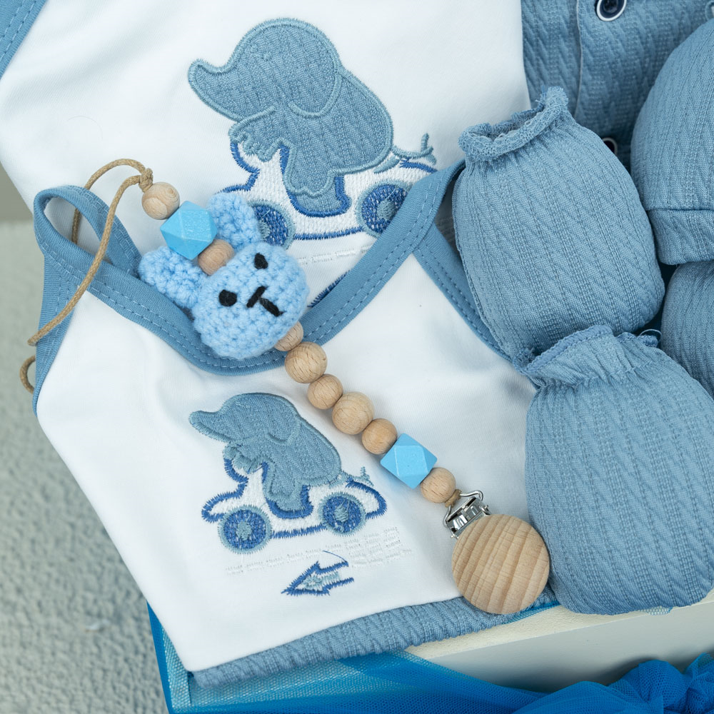 بوكس خشبي يحتوي على مستلزمات الطفل الاساسية.