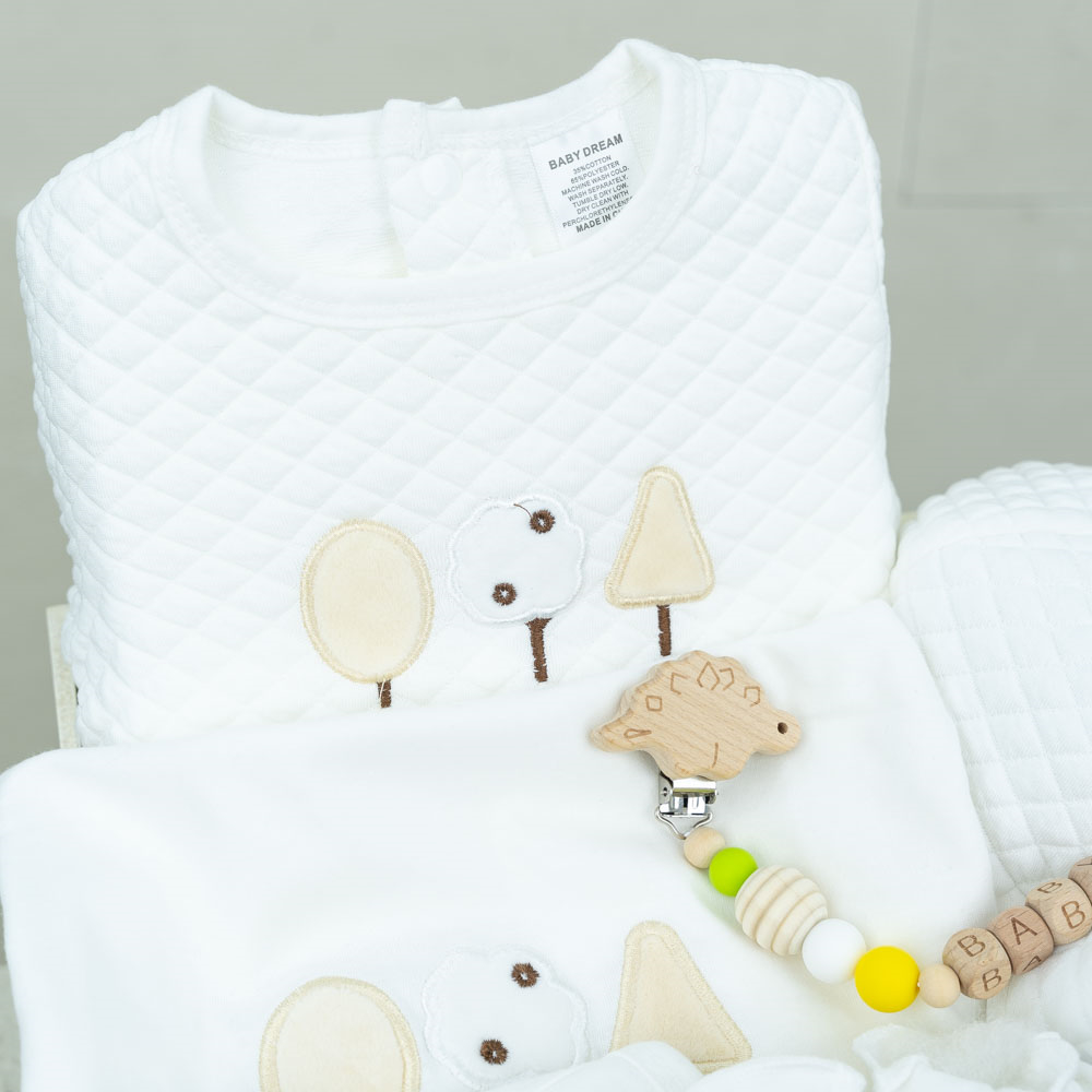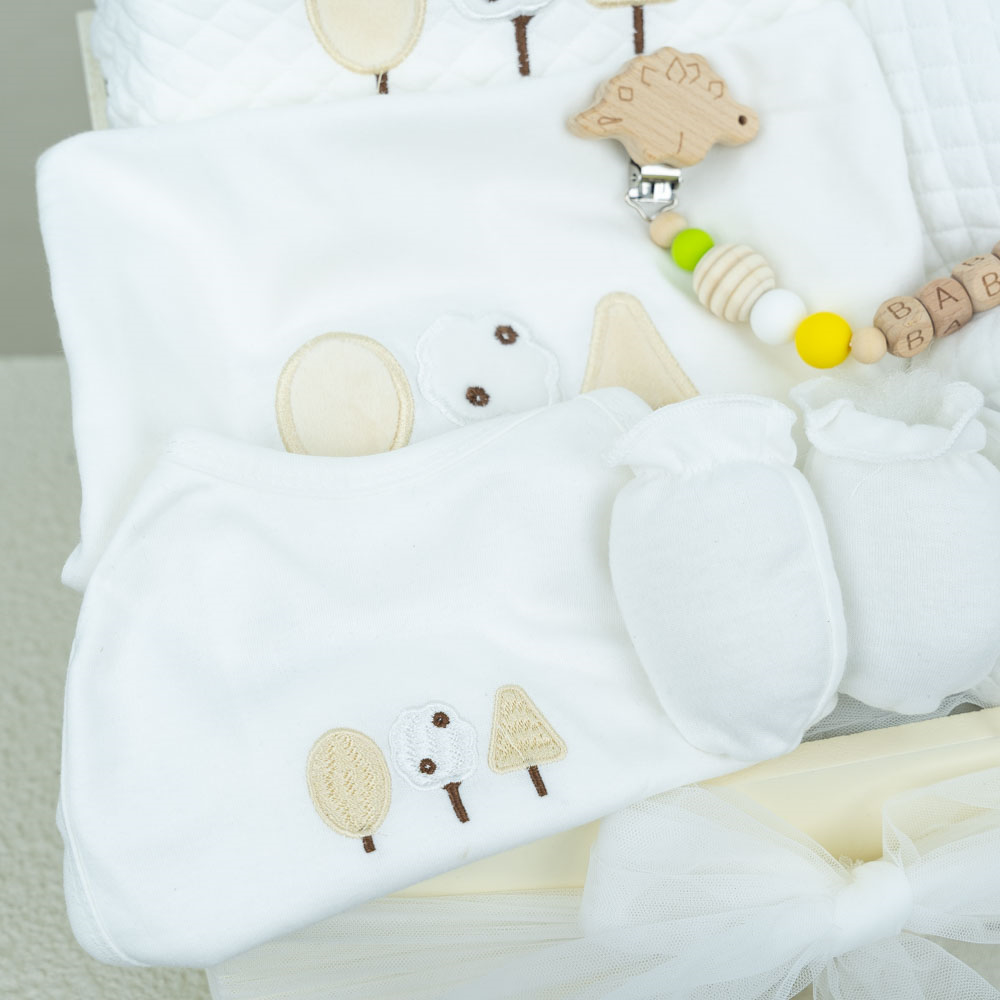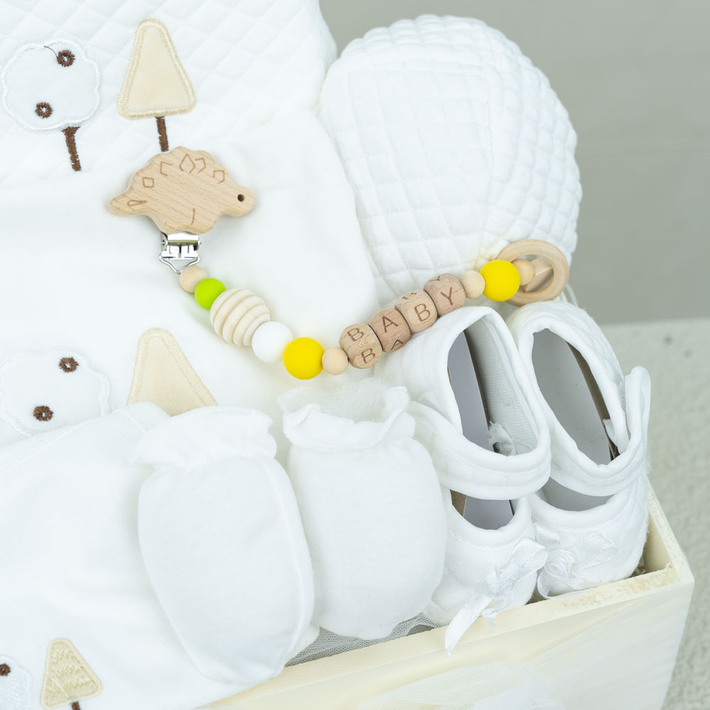 بوكس خشبي يحتوي على مستلزمات الطفل الاساسية.