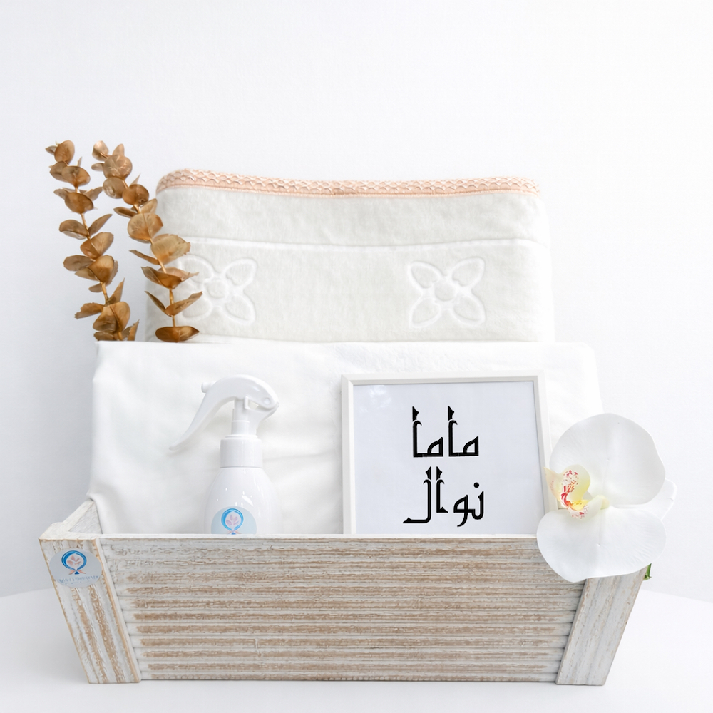 صندوق خشبي يحتوي على وسادة القلب، حقيبة مستحضرات تجميل، ربطة شعر، أقنعة وجه، كسارة تدليك للوجه، وكشط غوا شا على شكل قلب.