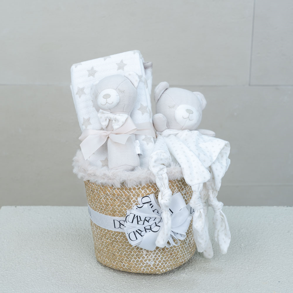 صندوق خشبي مزين بالبالونات والزهور يحتوي على مستلزمات الطفل الأساسية.