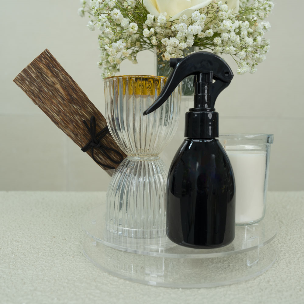 حامل دائري من الأكريليك مزين بزهور الجوري والجبسوفيلا يحتوي على مرش معطر للجو، مبخر، قطعة من البخور الفيتنامي وشمعة برائحة الفانيلا.