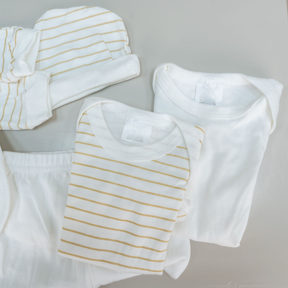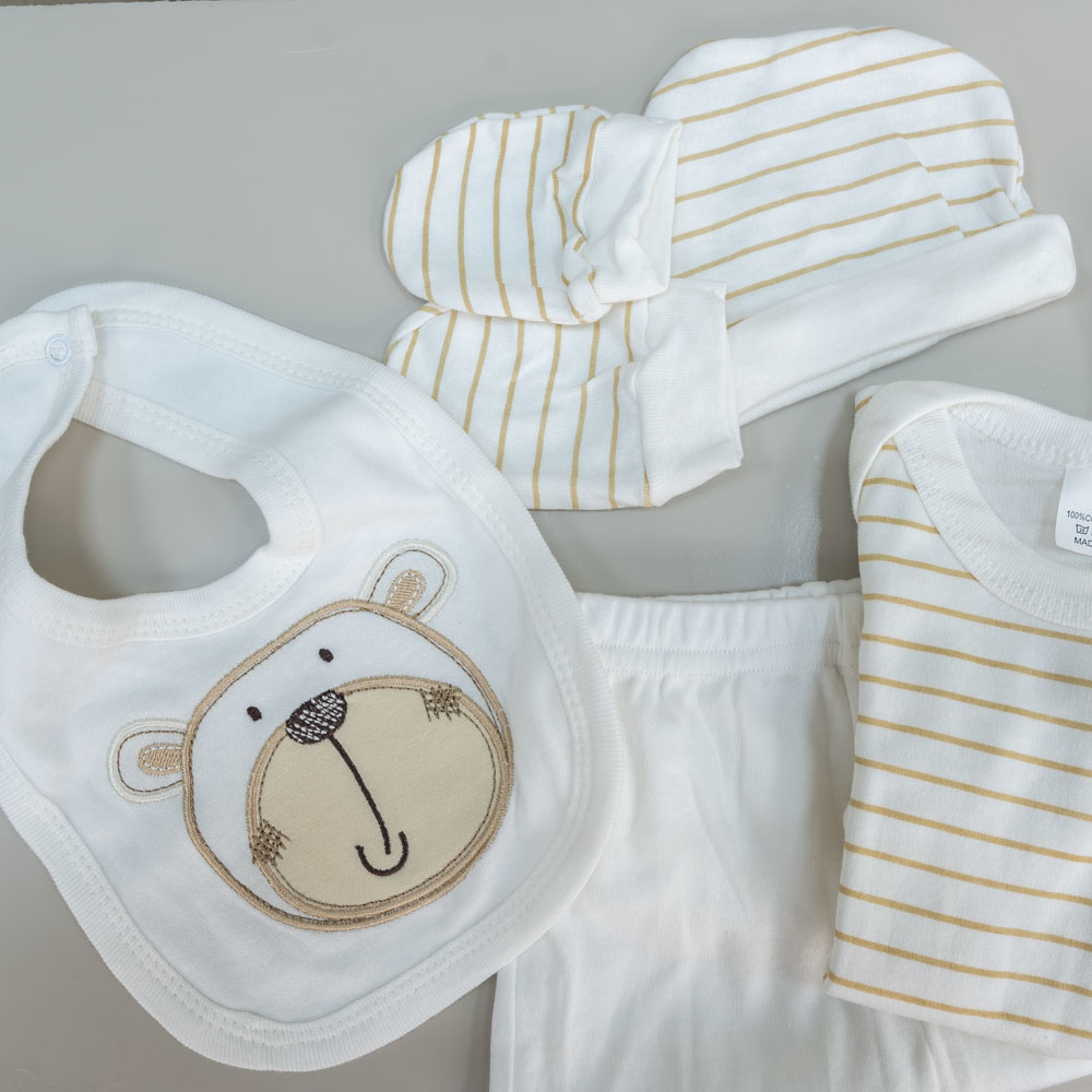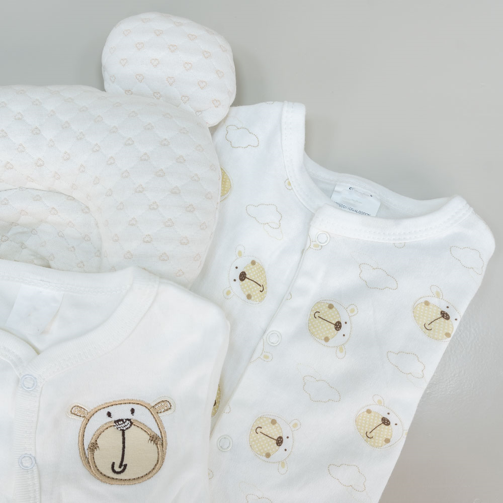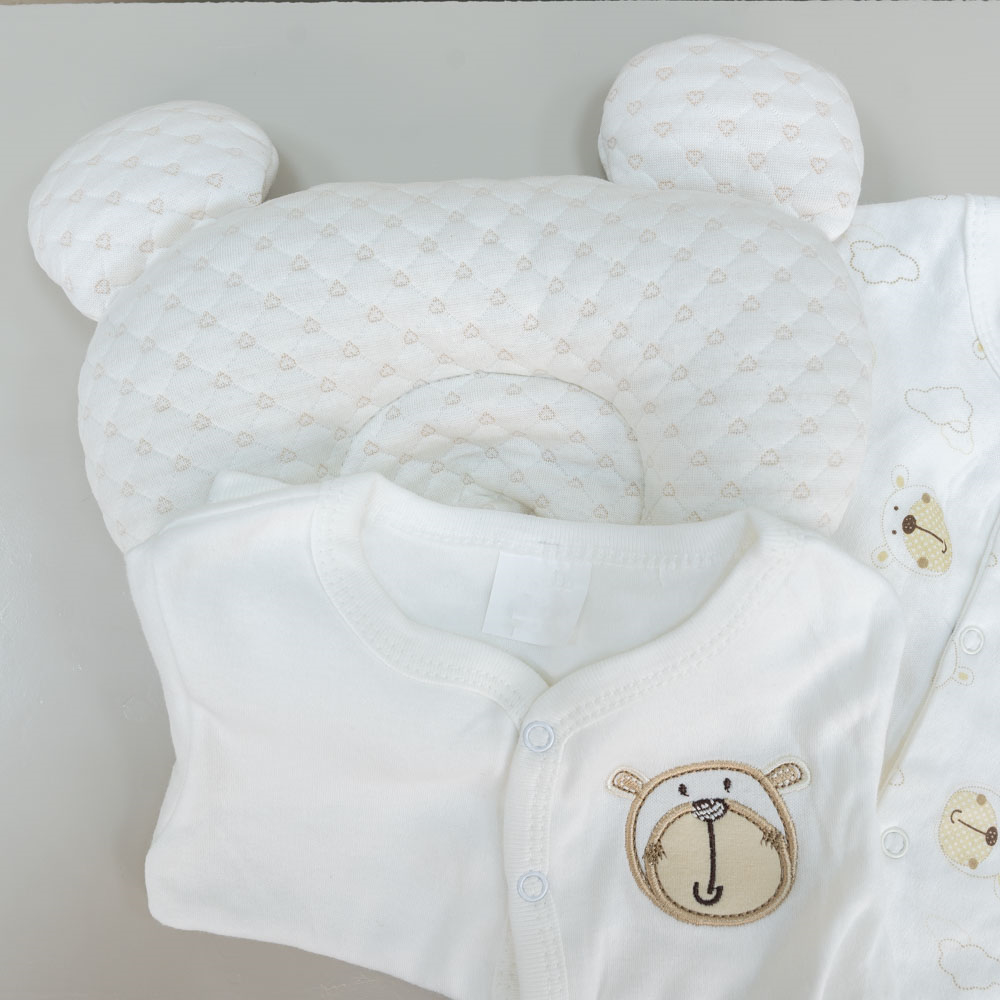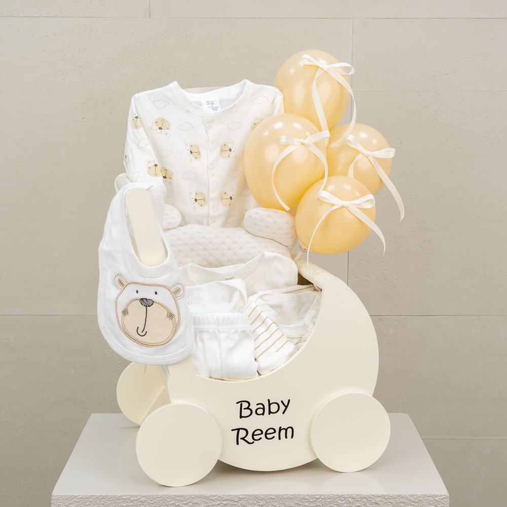 حامل خشبي على شكل عربة أطفال مع بالونات تحتوي على ملابس داخلية للأطفال ووسادة أطفال وقبعة أطفال وجوارب.