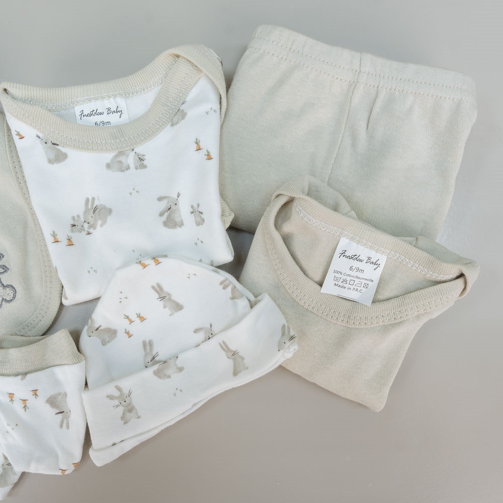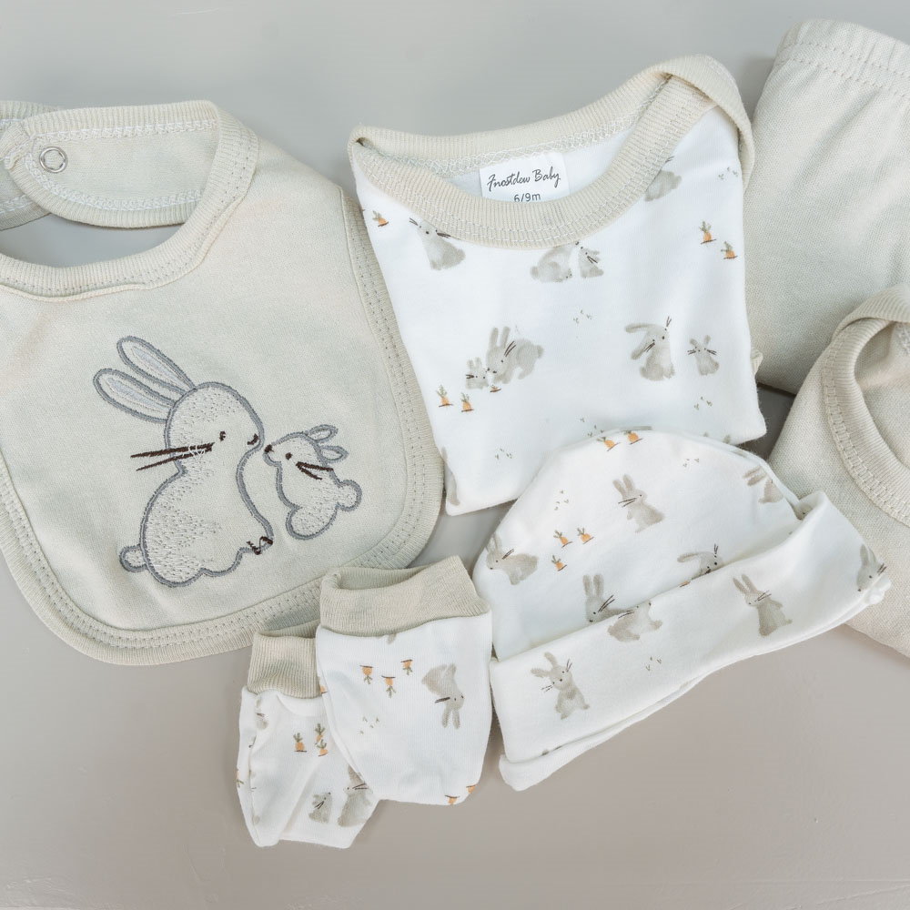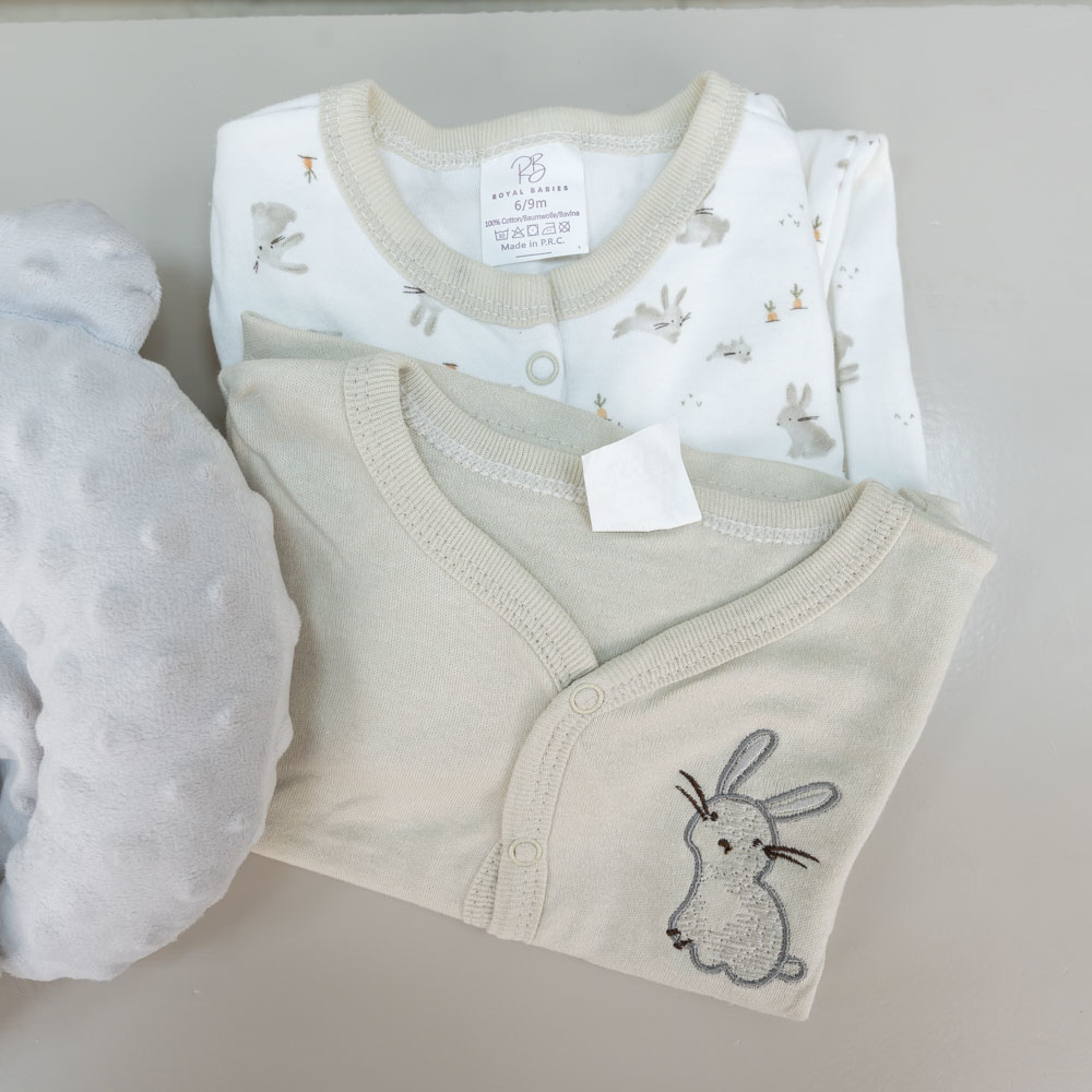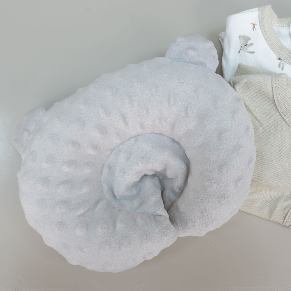 حامل خشبي على شكل عربة أطفال مع بالونات تحتوي على ملابس داخلية للأطفال ووسادة أطفال وقبعة أطفال وجوارب.