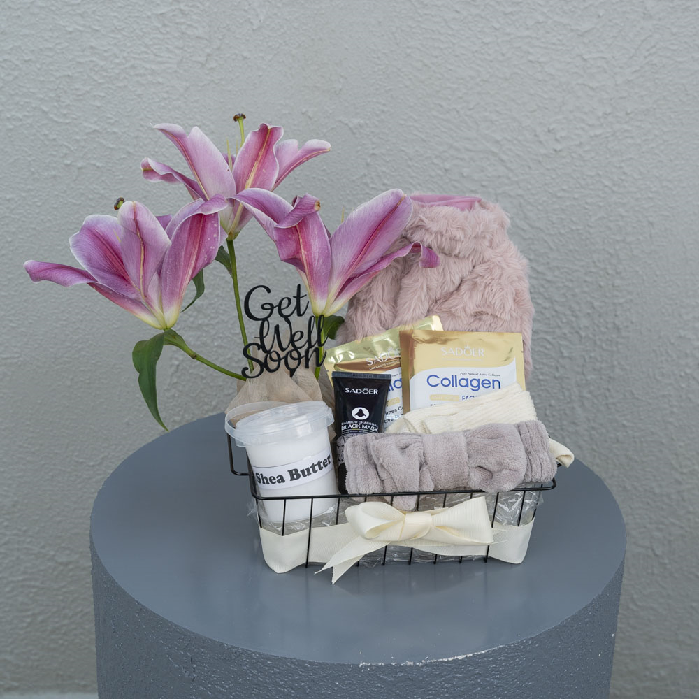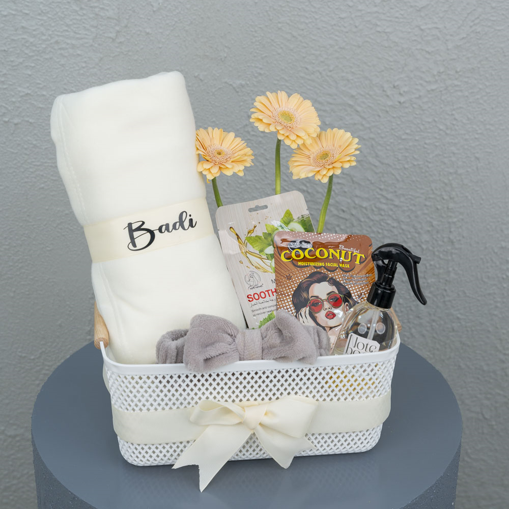 صندوق خشبي مزين بالزهور يحتوي على رداء بيجاما قياس موحد، كوب، شمعة، قناع تجميل للوجه وشاي أعشاب.