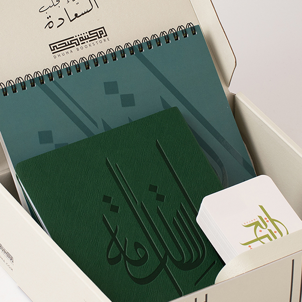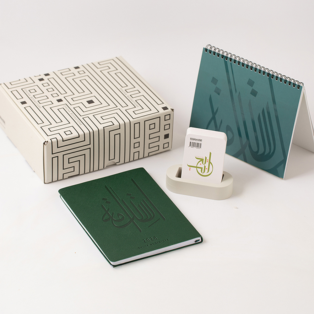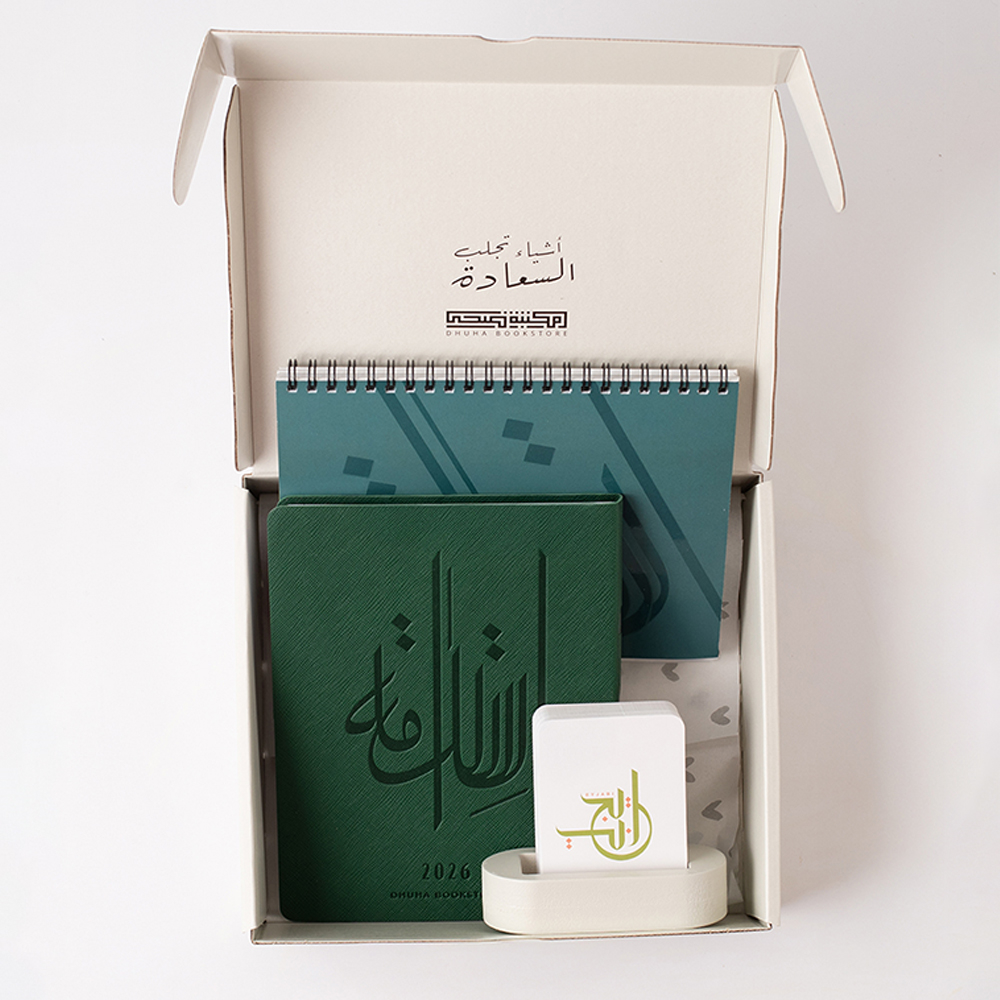 مجموعة أنيقة تحتوي على ثلاث قطع: تقويم هرمي 2026 باللون الأخضر، ومفكرة أسبوعية 2026 باللون الأخضر من الجلد المرن، وكرت إيجابي مع قاعدة خشبية، وتأتي داخل بوكس رمادي أنيق مما يجعلها خياراً مثالياً لهدية فاخرة ومؤثرة تلامس القلب وتلهم التغيير.