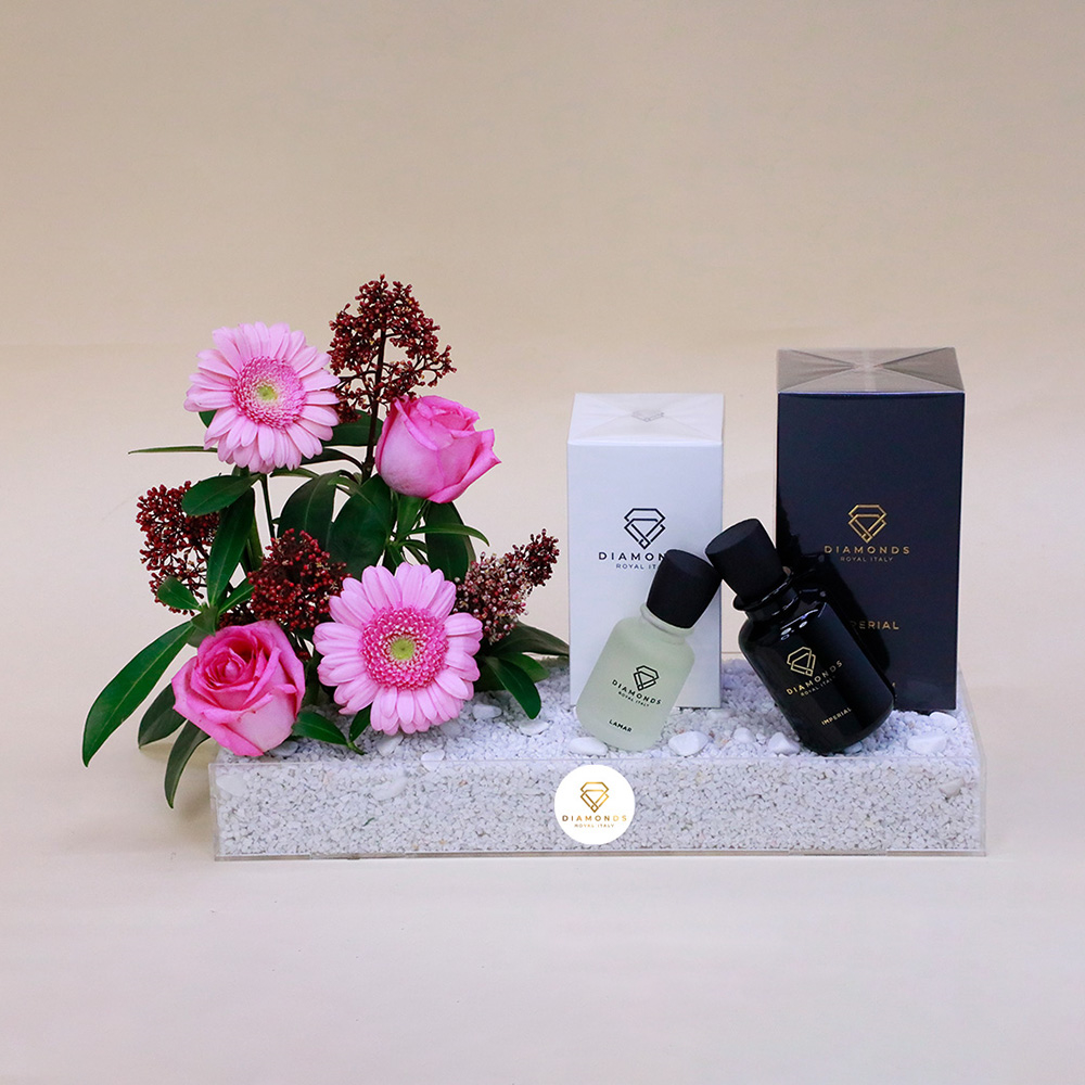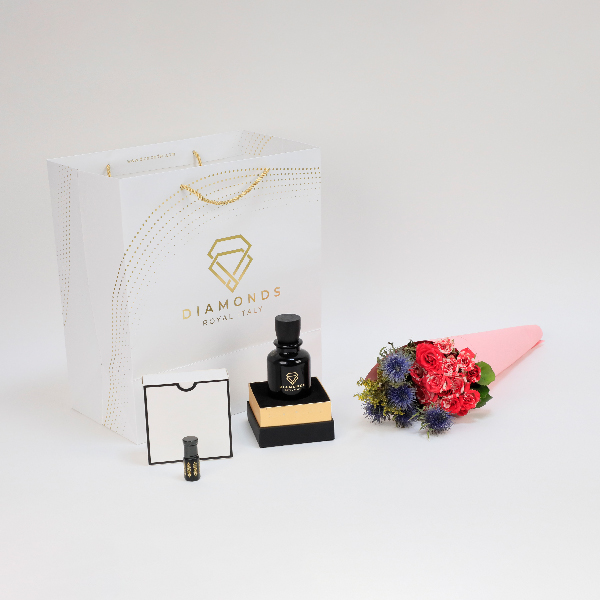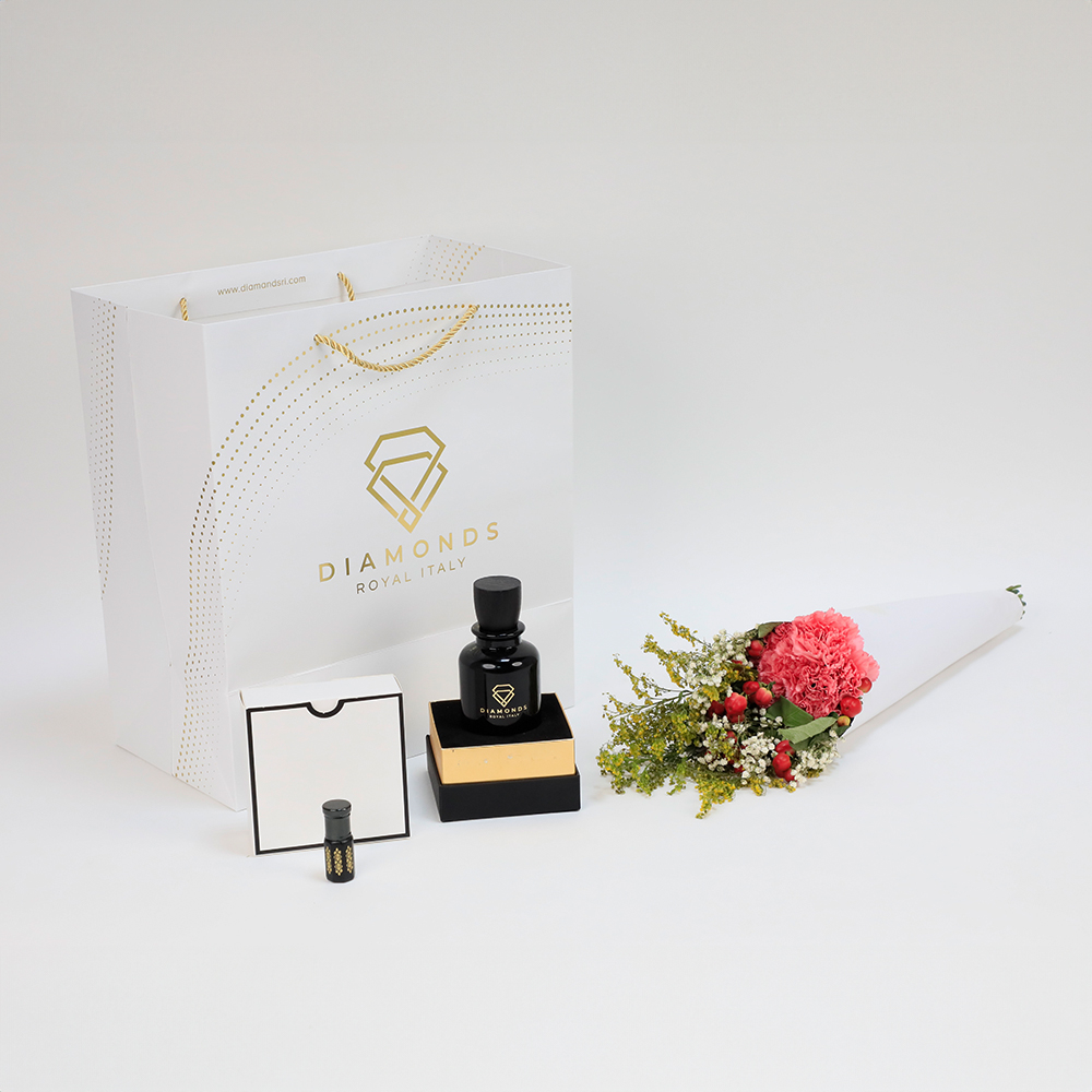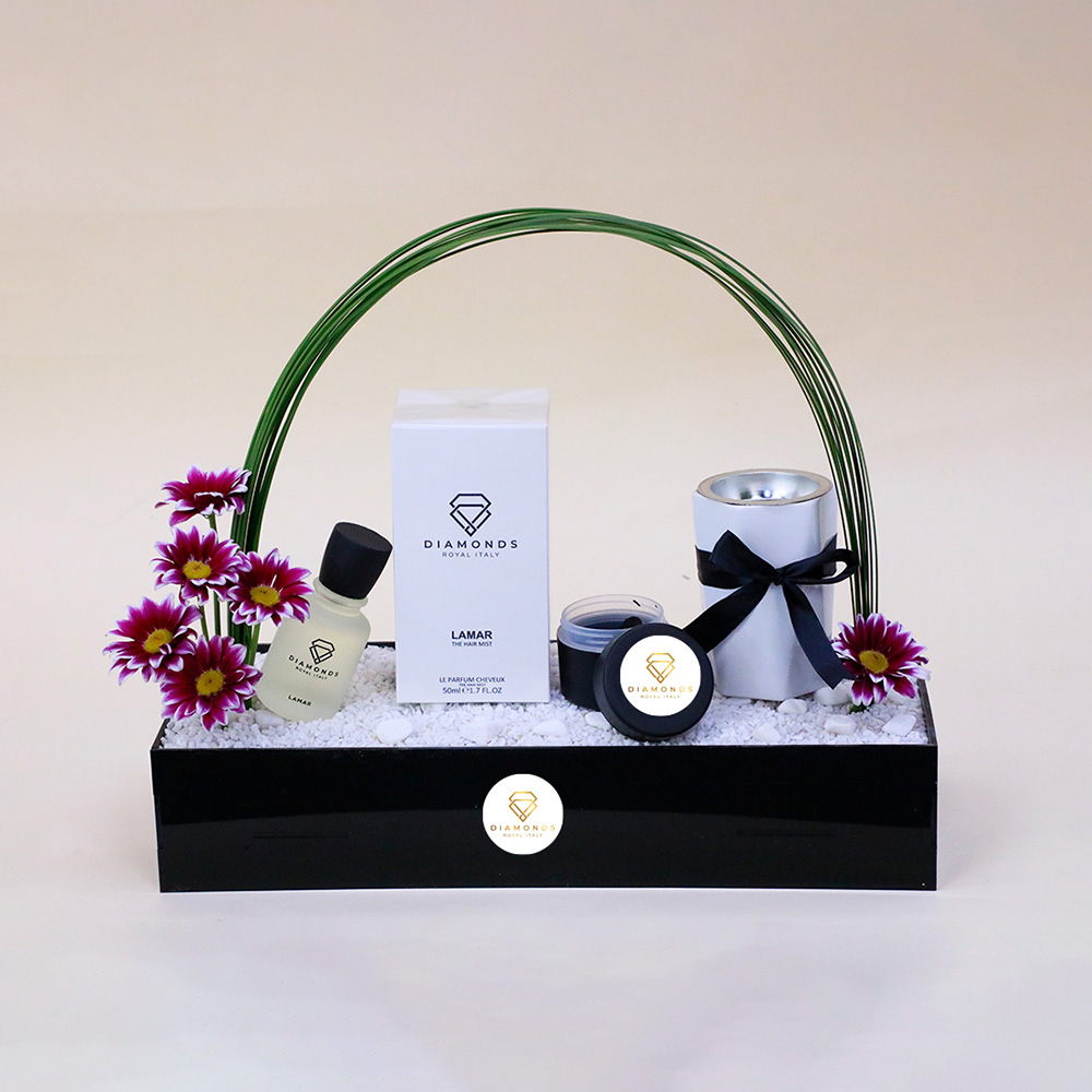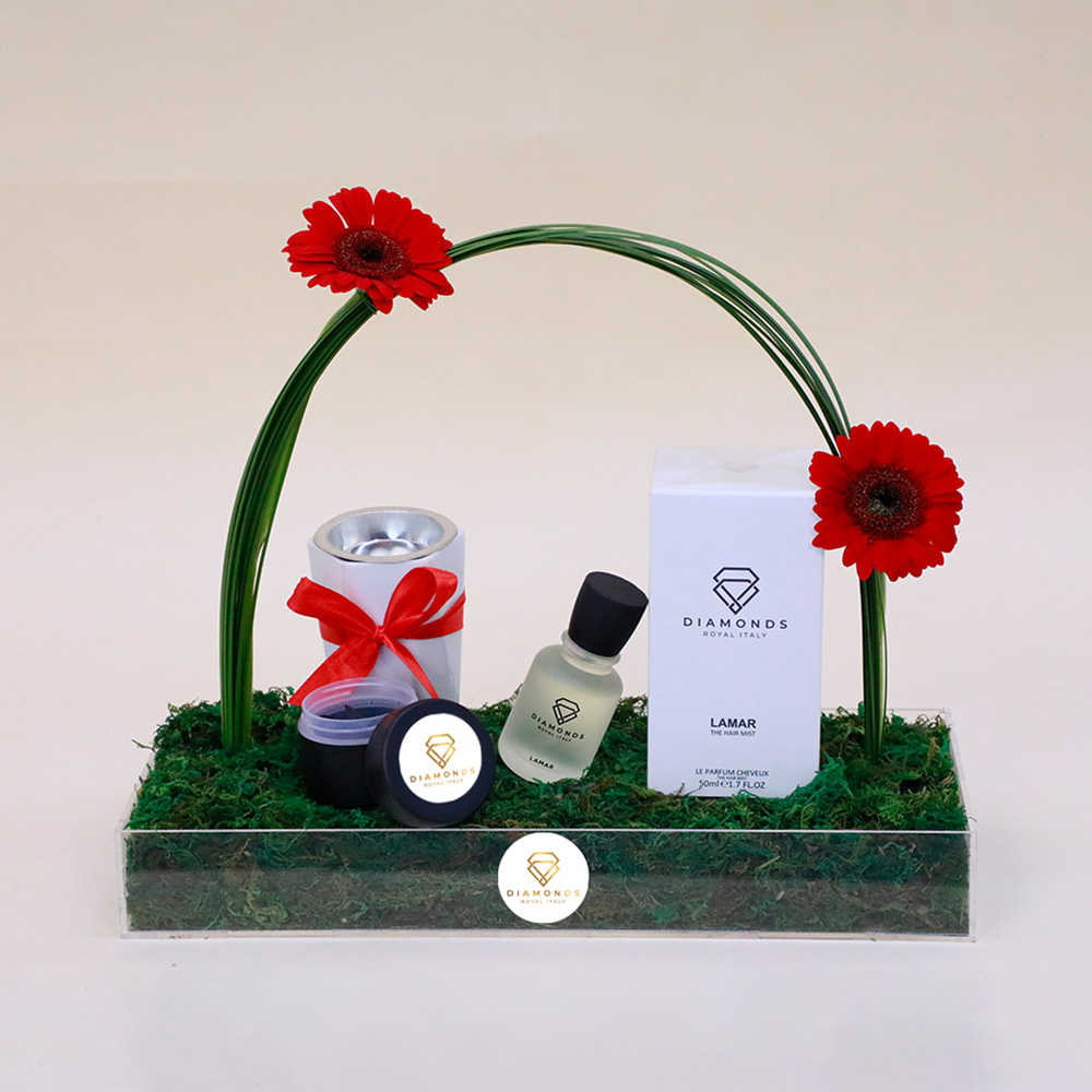 كيس يحتوي على باقة يد من الزهور، معمول بخور، 3 غرامات دهن عود، وعطر للشعر بحجم 50 مل مكون من: ماندرين، مانغوليا، مسك، وباتشولي.