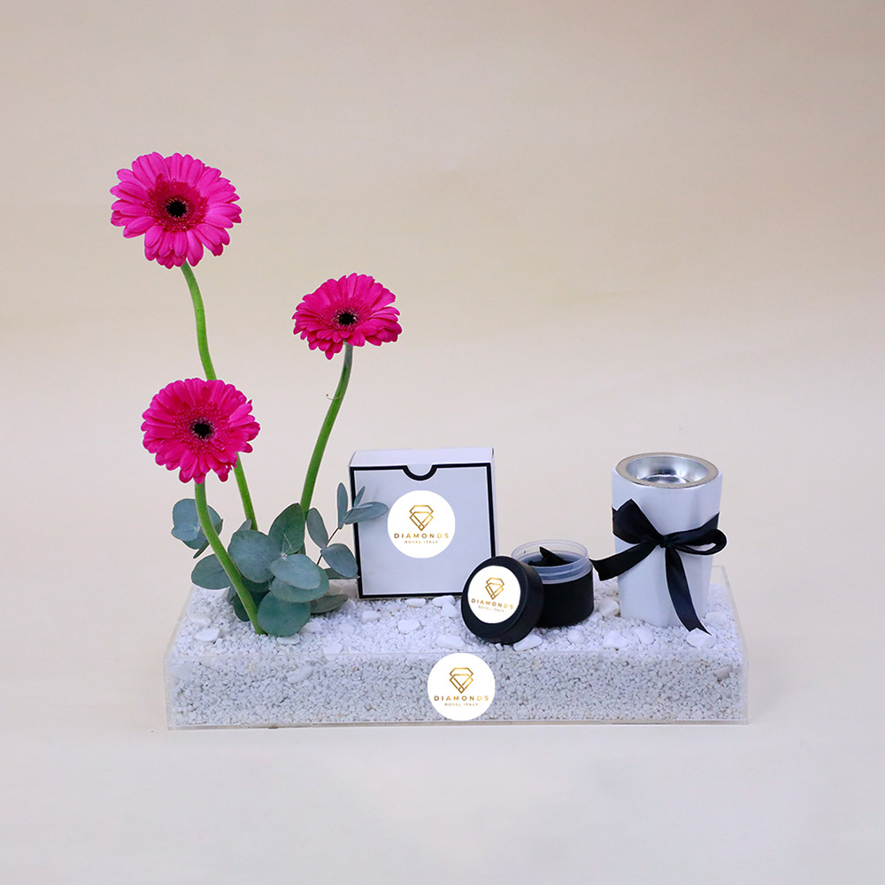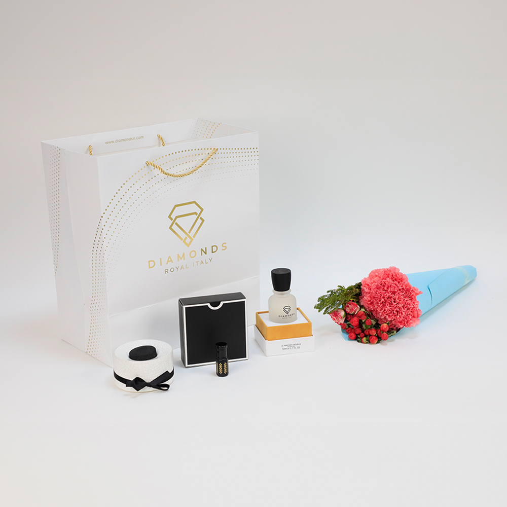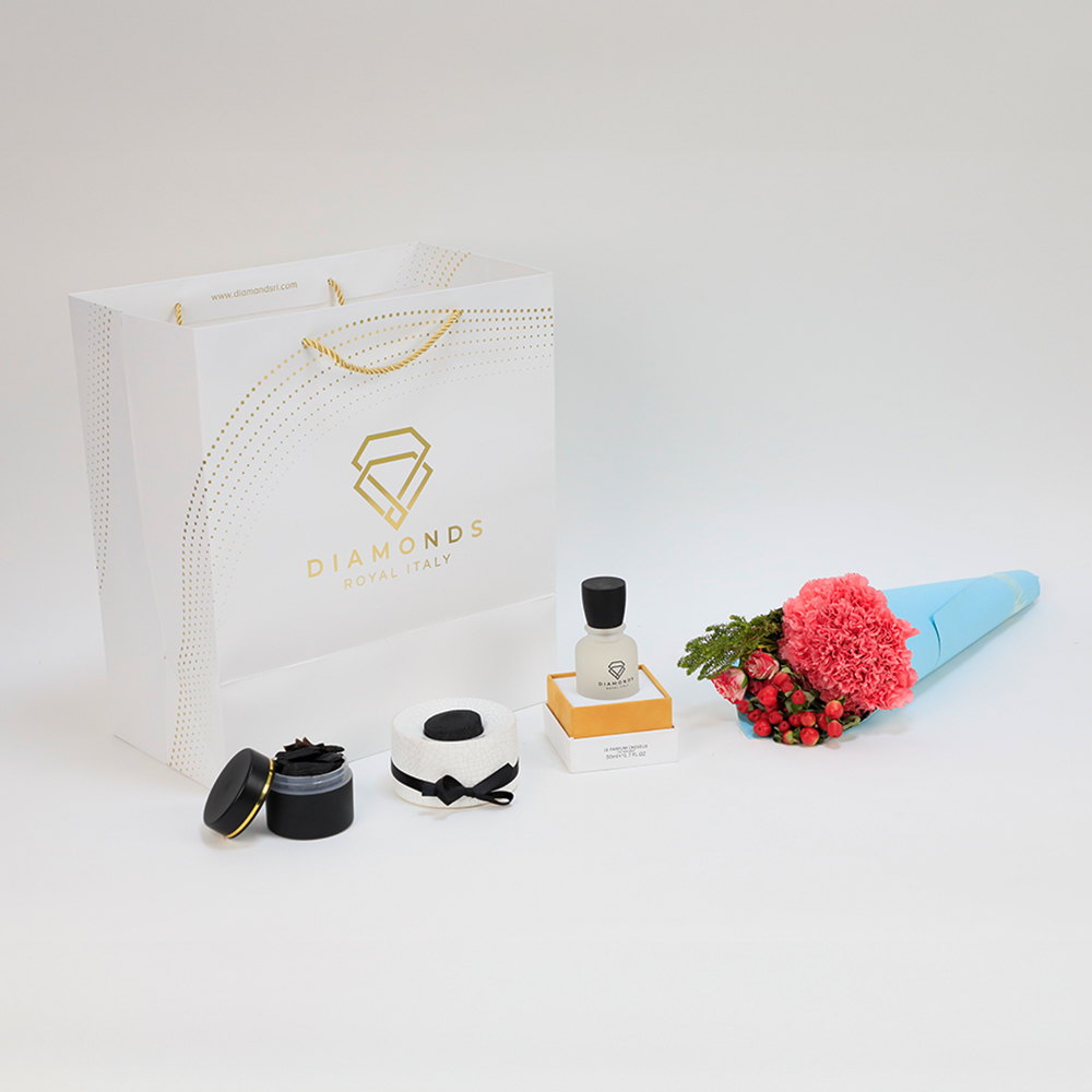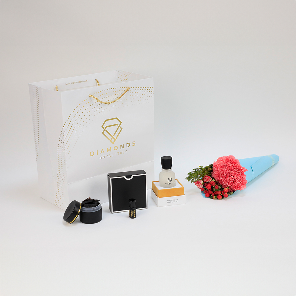 كيس يحتوي على باقة يد من الزهور، معمول بخور، 3 غرامات دهن عود، وعطر للشعر بحجم 50 مل مكون من: ماندرين، مانغوليا، مسك، وباتشولي.