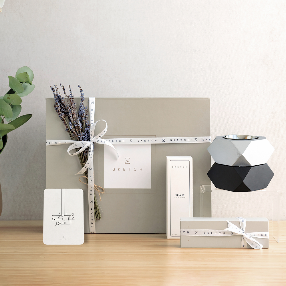 سلة تحتوي على رشوش 500 مل، مع فواحه 200 ملي برائحة زهر الروز، الباتشولي، الماندرين، المسك، الفانيلا، والياسمين مع الزهور.