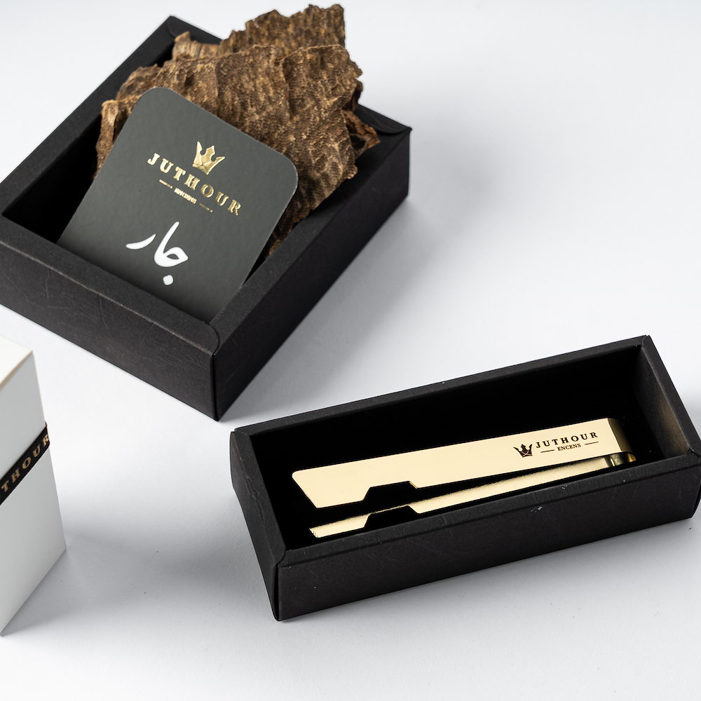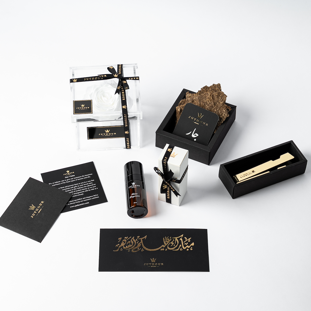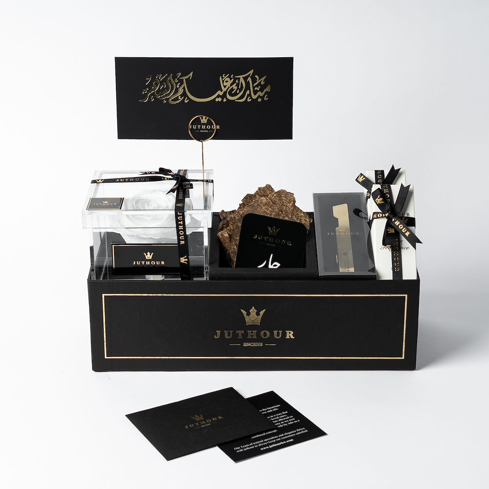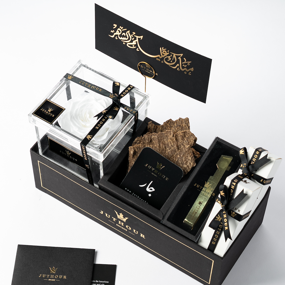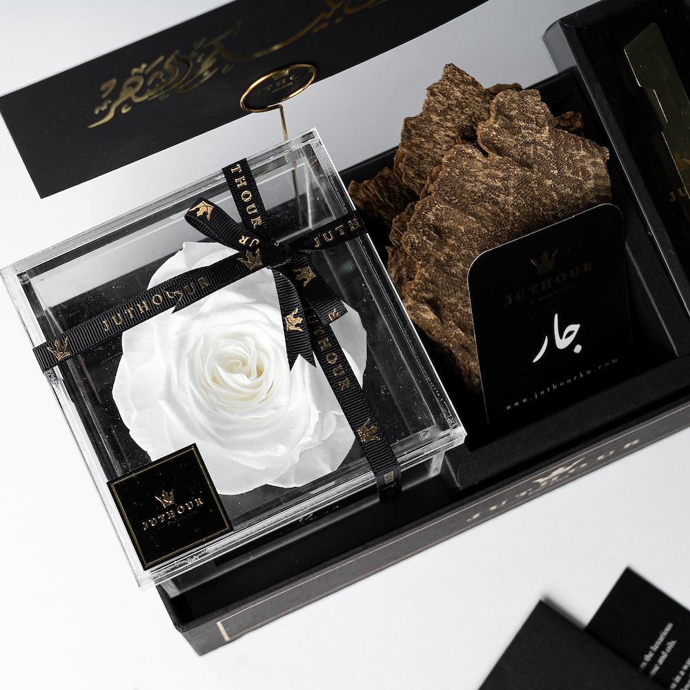بوكس هدايا دائم أنيق من جذور مناسب لشهر رمضان يضم زهرة بيضاء خالدة، ملقط ذهبي فاخر، 1 تولة بخور تشار فاخر، و2 هدية سبراي 50 مل، مع بطاقة اهداء شخصية وبطاقة مناسبة.