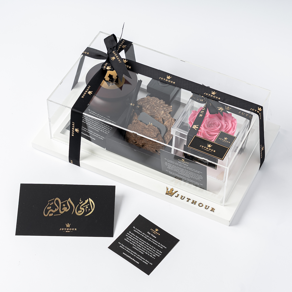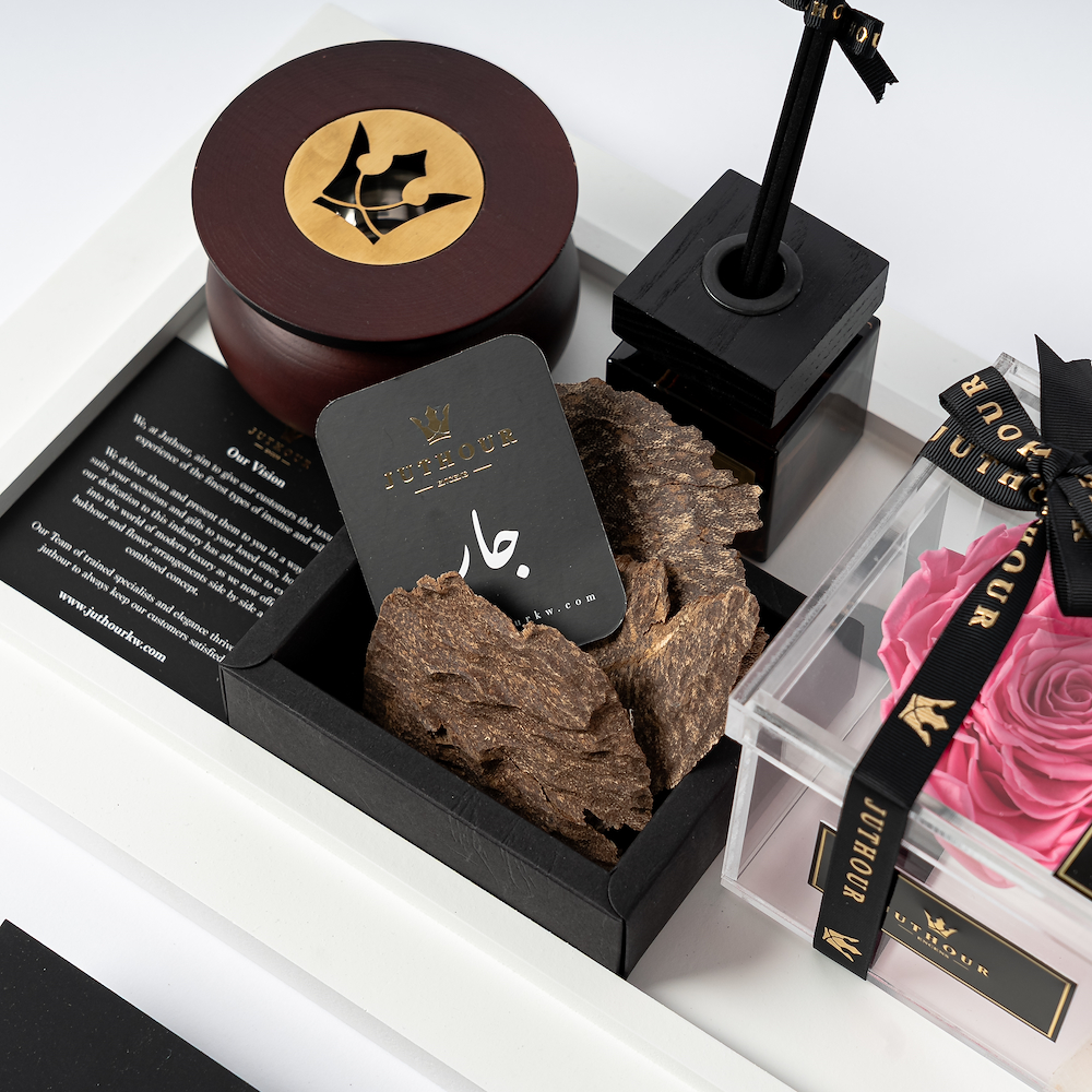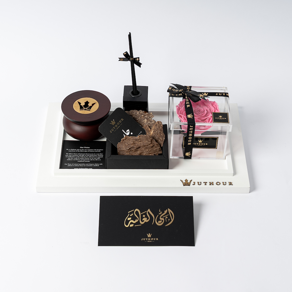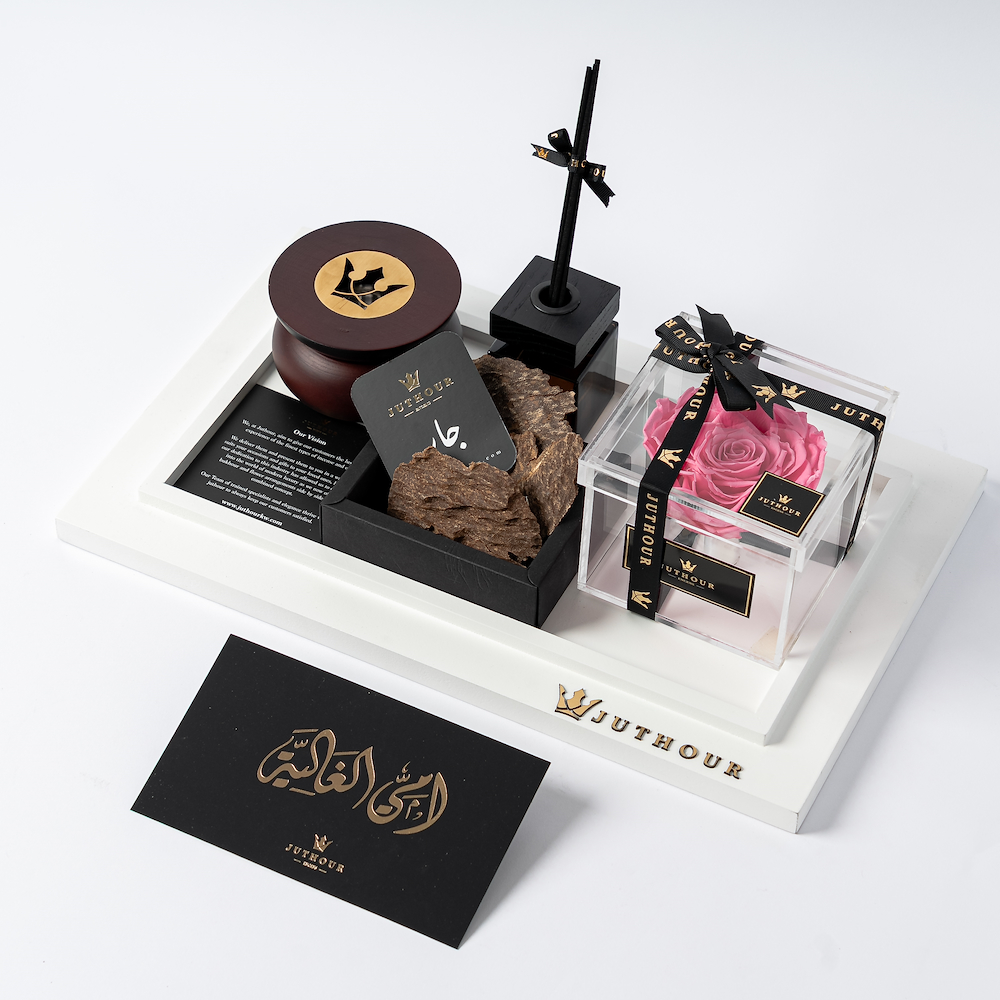 بوكس من جذور يضم زهرة وردية دائمة أنيقة، وناشر نورثن بحجم 100 مل، ومبخر جذور الدائري الأنيق، وتولة واحدة من بخور شار الفاخر. تكتمل الهدية بشكل جميل مع بطاقة مناسبة وبطاقة هدية مخصصة.