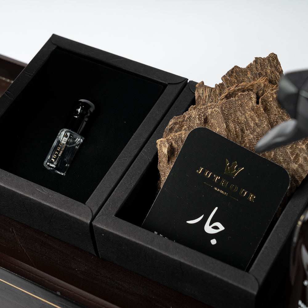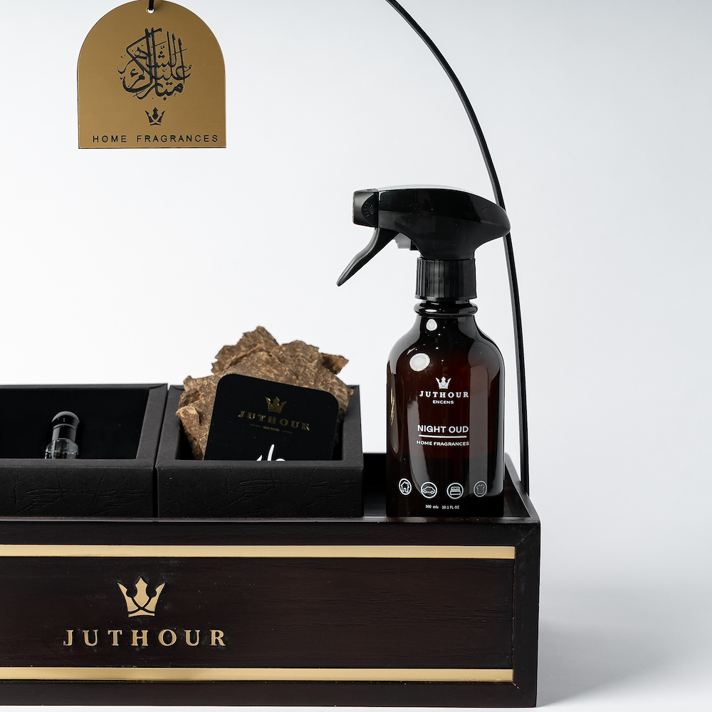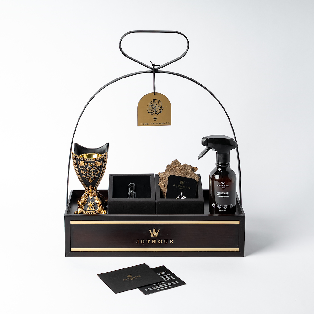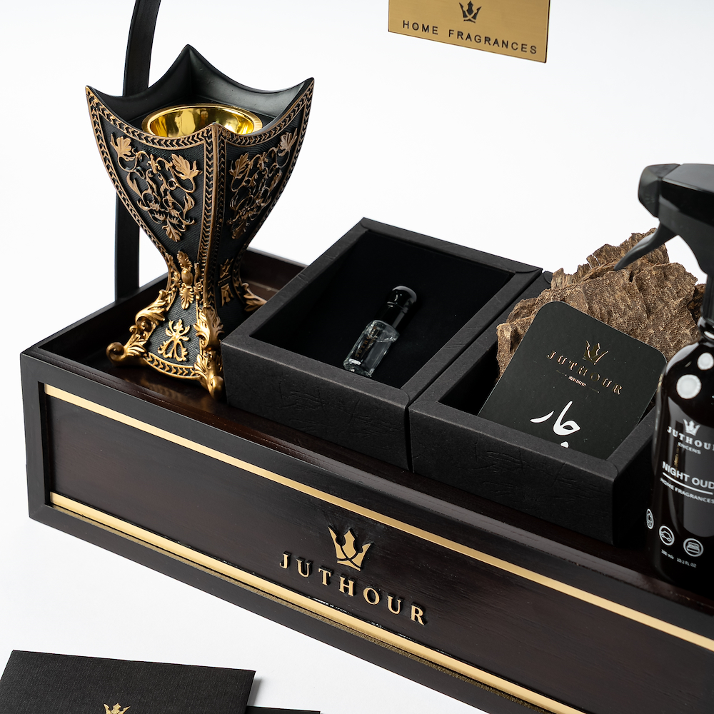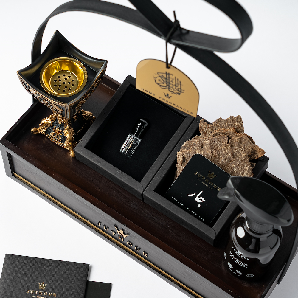 بوكس خشبي يدوي أنيق من جذور يضم مبخر كلاسيك فاخر، 1 تولة بخور تشار حصري، 3 مل مسك أبيض، وسبراي واحد 300 مل من الاكثر مبيعا، مع اكريليك مناسب للمناسبات.