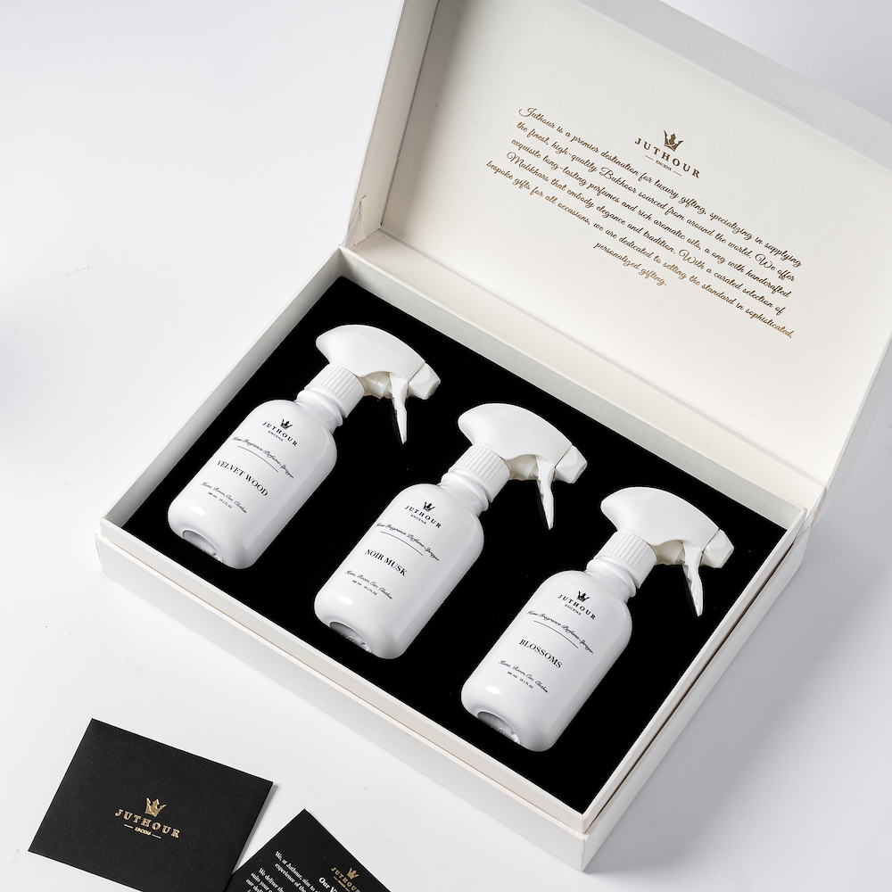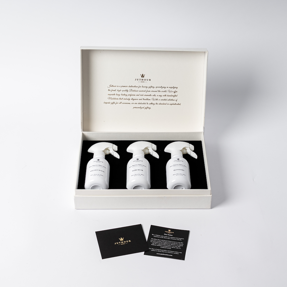 استمتع بالأناقة مع باقة بخاخات مجموعة وايت الفاخرة. تتضمن هذه المجموعة الحصرية ثلاث عبوات بيضاء بسعة 300 مل، صُممت بعناية لتجمع بين الطابع الكلاسيكي والأناقة الراقية. مثالية لمنتجات العناية الشخصية أو العطور المنزلية المفضلة لديك، حيث تضيف هذه الباقة الفاخرة لمسة نظيفة وراقية مع وظائف عملية ومتعددة تناسب روتينك اليومي نوير مسك مرش عطري بحجم ٣٠٠ مل حيث يبدأ العطر بنفحات مسك دافئة مع لمسة حمضية خفيفة، ويتوسطه قلب من أزهار الياسمين والزهور البلجيكية. وفي النهاية يظهر الورد ممزوجًا بخشب الأرز ولمسة فانيلا خفيفة وباردة بلوسومز مرش عطري بحجم ٣٠٠ مل حيث يبدأ بنفحات منعشة تعكس إحساس الهواء النقي، يتبعها قلب ناعم من القطن والزهور البيضاء مع لمسة أعشاب خفيفة، ويستقر على مسك أبيض وزهرة البرتقال فلفت وود مرش عطري بحجم ٣٠٠ مل حيث يبدأ العطر المنعش بنفحات ناعمة من الأخشاب البيضاء والأعشاب مثل الريحان، ممزوجة بزهرة البنفسج والتوت البري، مع لمسة برغموت تظهر في نهاية العطر