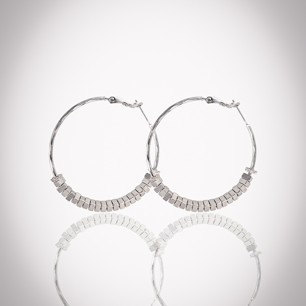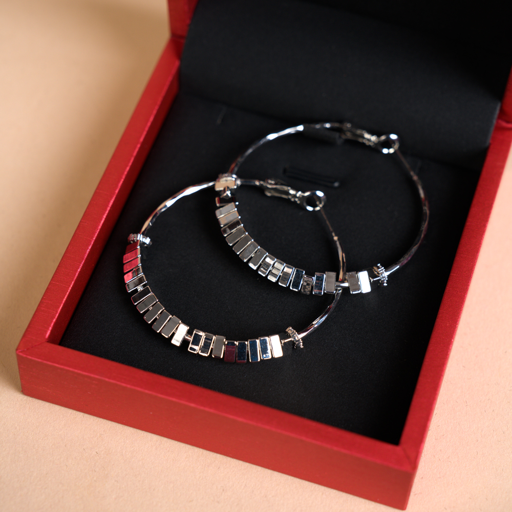 قرط تشارمز حلق مطلي بالذهب الأبيض يتميز بتصميم فريد لامع بقص ليزري مع تعليقات متحركة ويمنح أناقة خالدة تعزز أي إطلالة ويخلق تأثيرا يلتقط الضوء من كل زاوية، تم تصميم القرط ليجمع بين الراحة والأناقة مما يجعله مثاليا للمناسبات الخاصة والاستخدام اليومي.