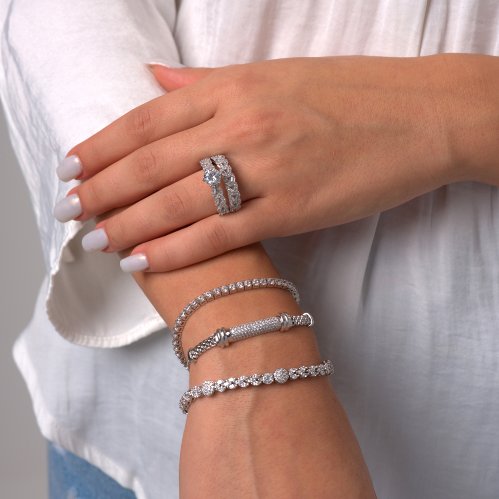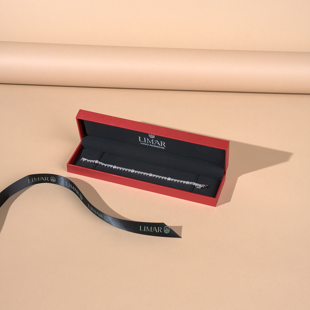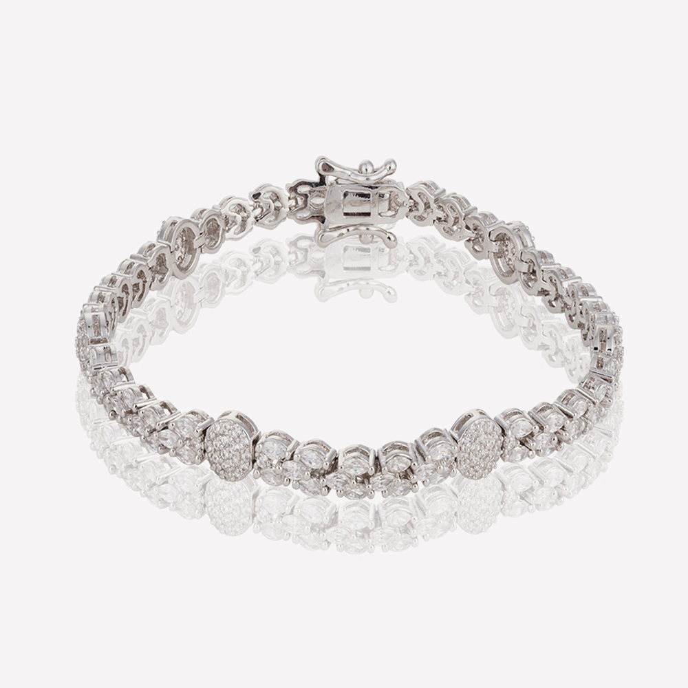 سوار فيور سوار مطلي بالذهب الأبيض، يتميز بتصميم فريد يجمع بين أحجار مقطوعة بشكل ماركيز وأخرى دائرية متناسقة بعناية، ومزينة بزركون نقي متلألئ، ومطلي بطبقة من الروديوم الأصلي لضمان أناقة خالدة تضيف لمسة راقية إلى أي إطلالة. يتم اختيار كل حجر زركون بعناية فائقة لما يتمتع به من بريق وصفاء، مما يخلق تأثيرًا ساحرًا يلتقط الضوء من كل زاوية. كما صُمّم السوار ليجمع بين الراحة والأناقة، مما يجعله مثاليًا للمناسبات الخاصة وكذلك للاستخدام اليومي.
