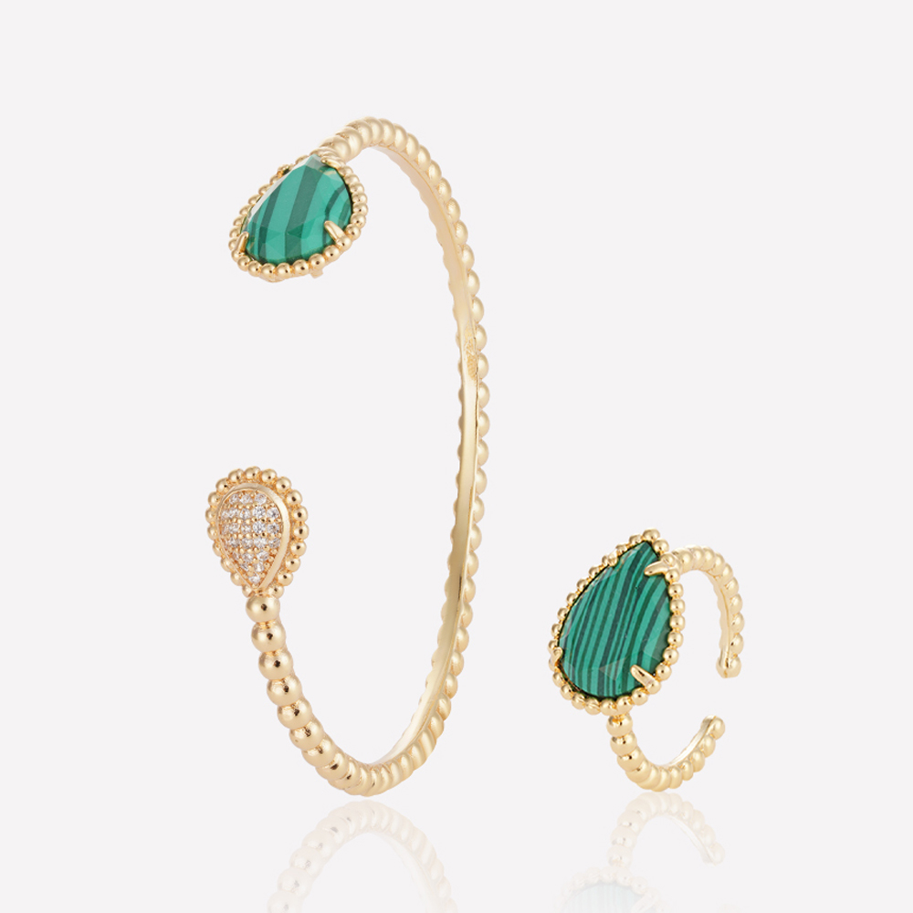 طقم ملاكيت أوفال، سوار وخاتم مطليان بالذهب الأصفر بتصميم مفتوح، يتميزان بحجر بلون المالاكيت مع توهج دافئ لطلاء الذهب الأصفر. هدية مثالية تضيف لمسة من الأناقة لأي مناسبة رسمية أو احتفال مميز، كما أنها مناسبة للاستخدام اليومي. يجسد هذا الطقم جمال أساليب المجوهرات العصرية.