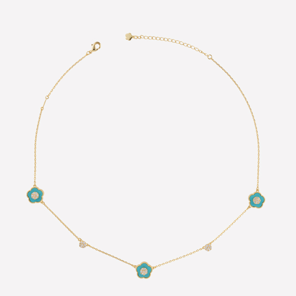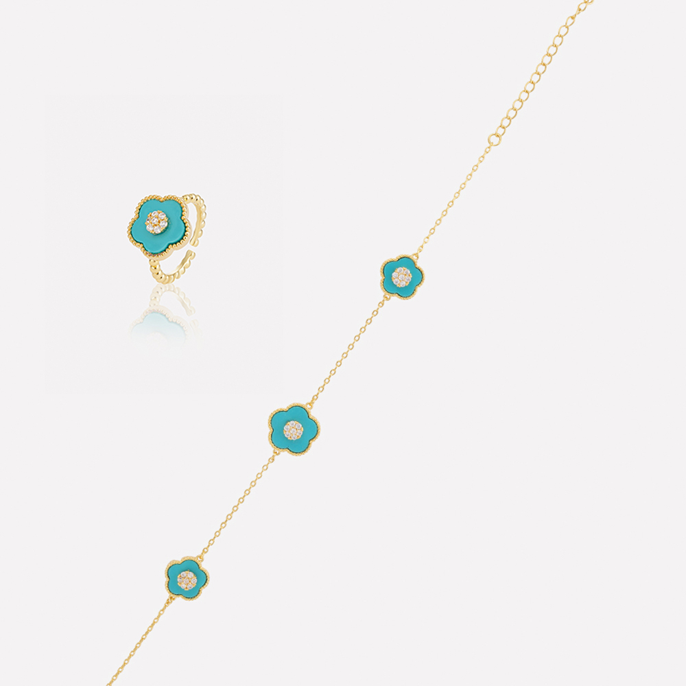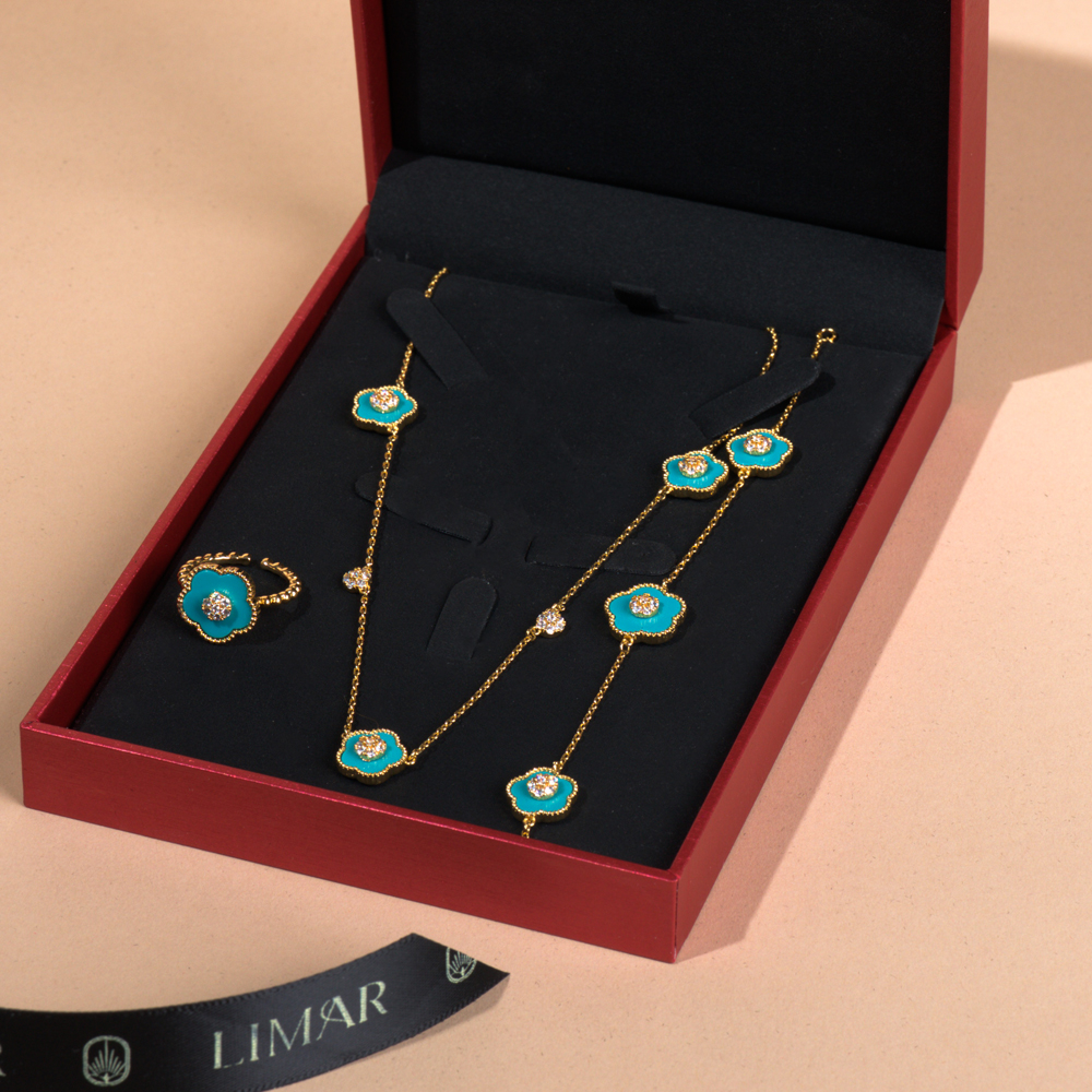 مجموعة ميرا الفيروزية مطلية بالذهب الأصفر عيار 18 قيراط، مزينة بأحجار زركون نقية متلألئة مع لمسة لون الفيروز. تصميم أنيق يجمع بين العصرية والفخامة، مثالي للمناسبات الخاصة ويضيف لمسة راقية لإطلالتك اليومية.