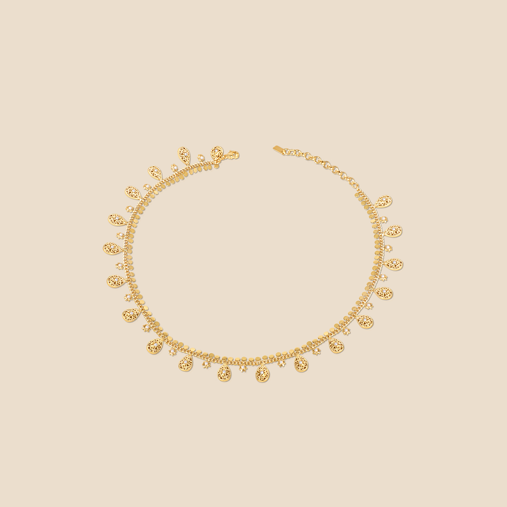 عقد أنيق يجمع بين الفخامة والأناقة العصرية. مطلي بالذهب عيار 21 ليمنح العقد لمعاناً ساحراً يبرز جمال الإطلالة ويكمل أي مظهر يومي أو رسمي. صمم بعناية فائقة مع تفاصيل دقيقة وجودة عالية، ليكون اختياراً مثالياً للإطلالات اليومية أو المناسبات الخاصة، كما يعد هدية راقية تعكس الذوق الرفيع والفخامة.