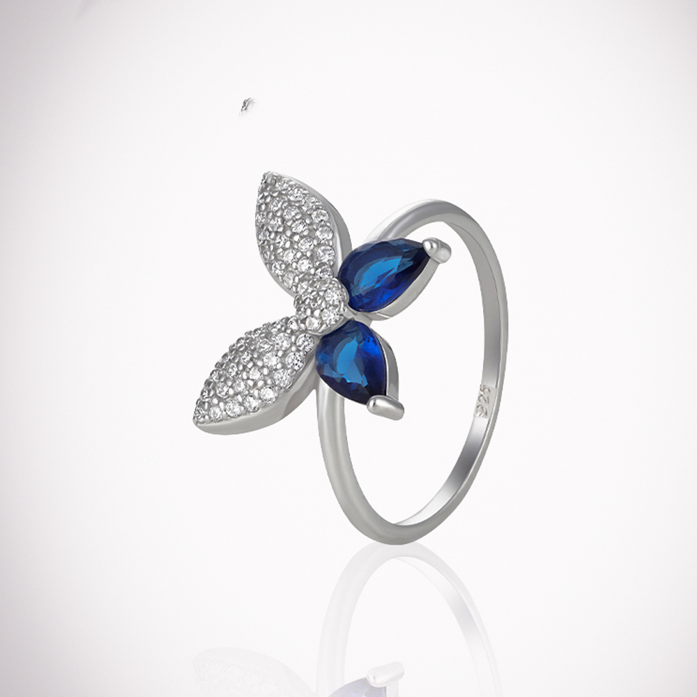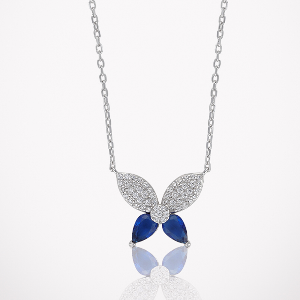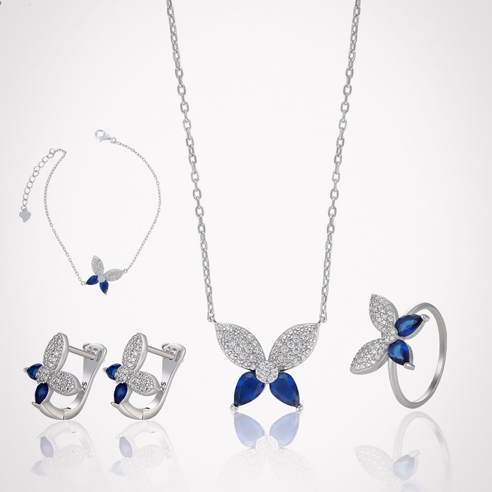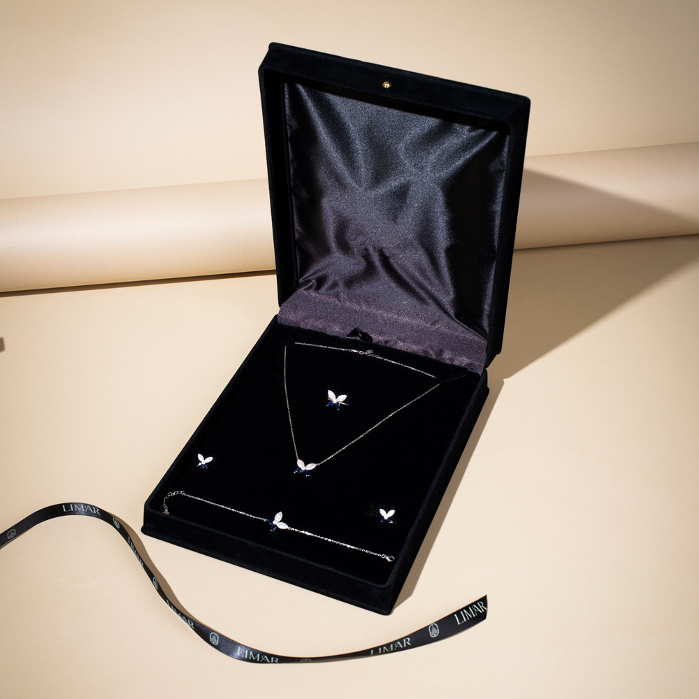 طقم من الفضة عيار 925 بتصميم فراشات من مجموعة همس مع احجار زركون نقية متألقة بلون الزفير الازرق الداكن، صمم ليضيف لمسة من الاناقة الى اي اطلالة، وتمنح الطبقات الناعمة مظهرا جذابا يجعله مناسبا للمناسبات الرسمية الكاجوال وللاستخدام اليومي، كما تم طلاء المنتج بمعدن الروديوم الثمين لضمان ثبات اللون ولمعان يدوم طويلا.